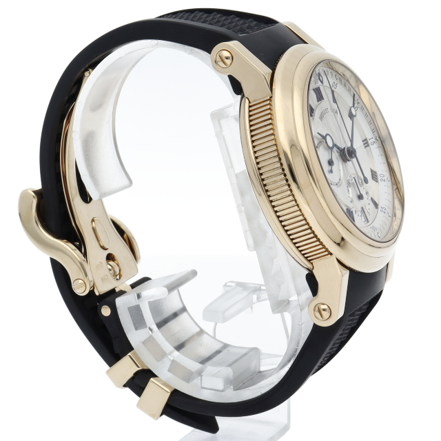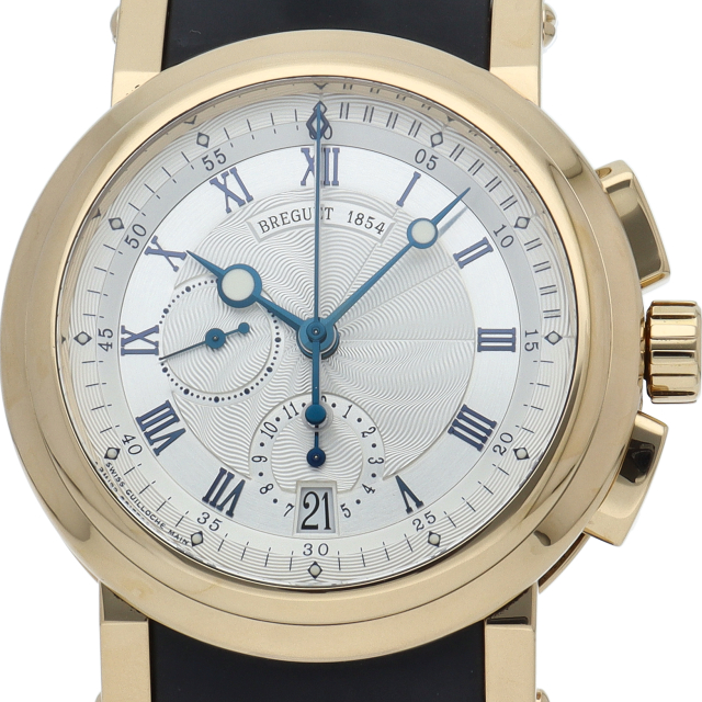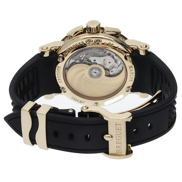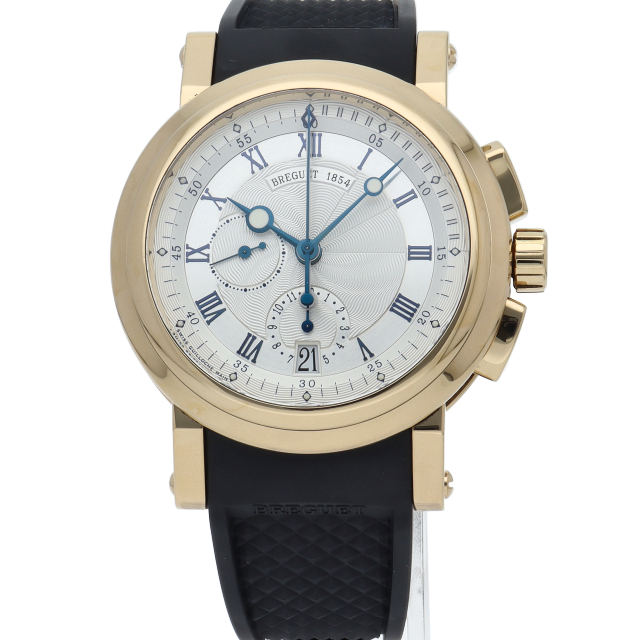 ブレゲの中でも特に人気のあるスポーツライン「マリーン2」。こちらはケースにイエローゴールドを使用し、高級感あるデザインが人気の秘訣です。クロノグラフ機能を搭載、裏スケルトン仕様のため、美しいムーブメントをご覧になることができます。