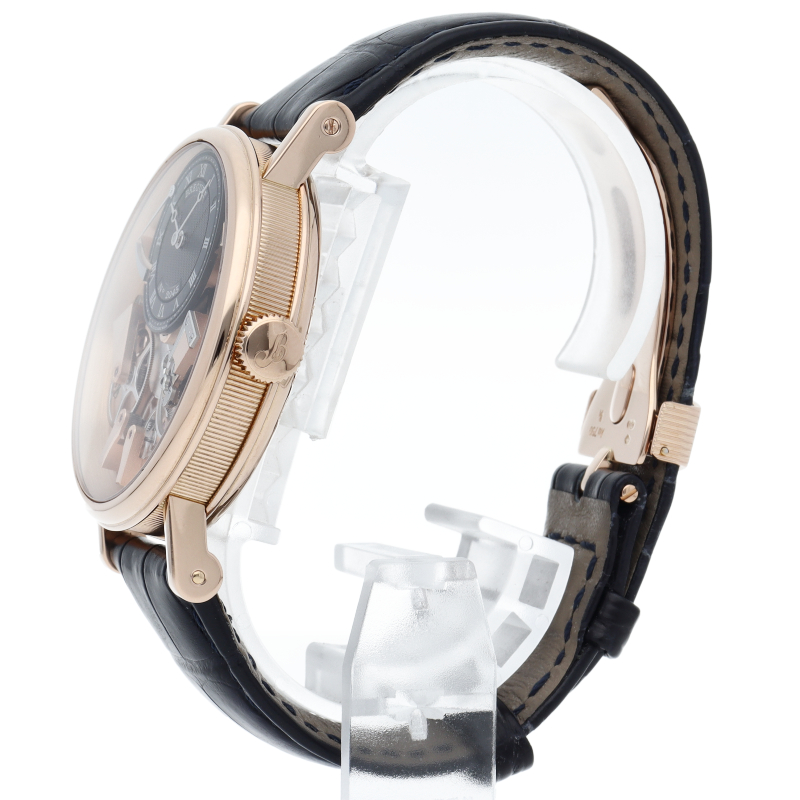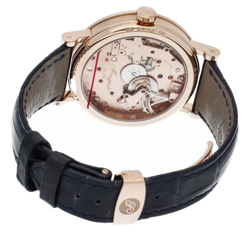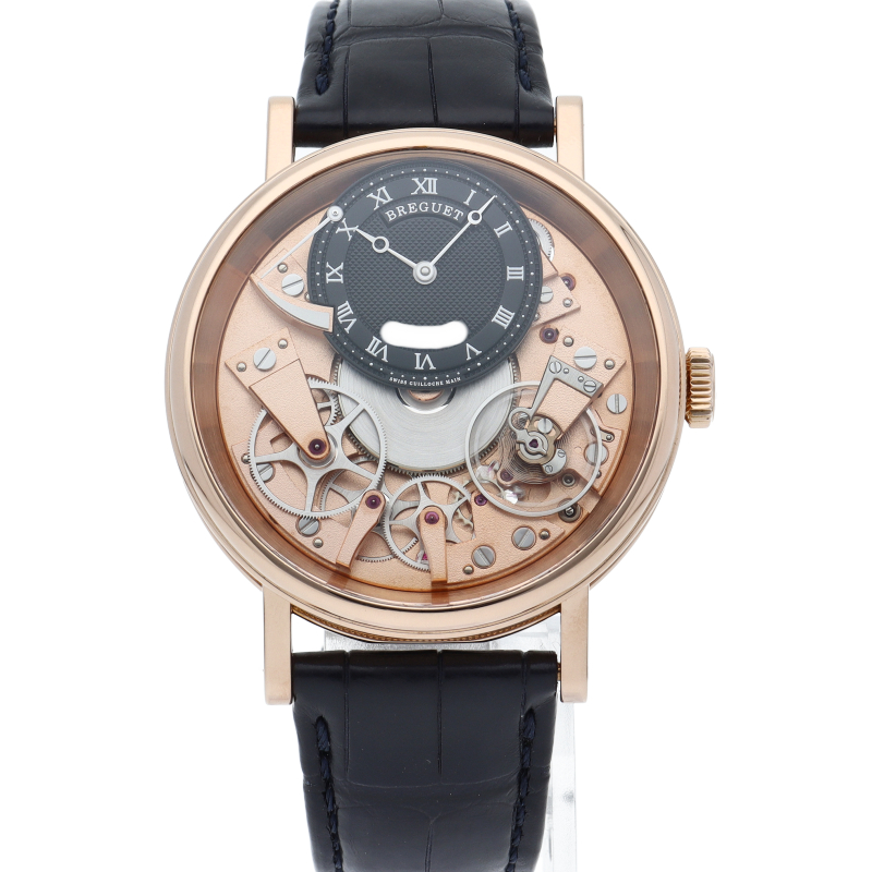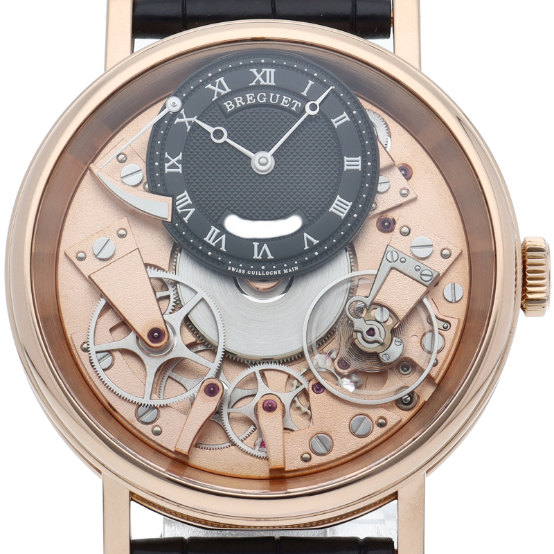 ブレゲを代表する人気モデルとして両面シースルーの文字盤から美しい機械が見える「トラディション」。機械時計フリークのみならず、見る人を魅了します。