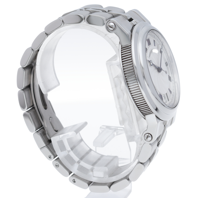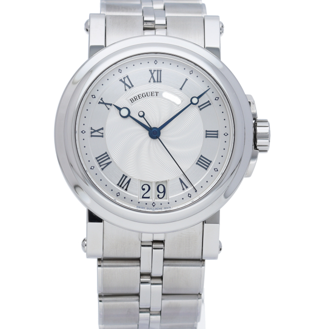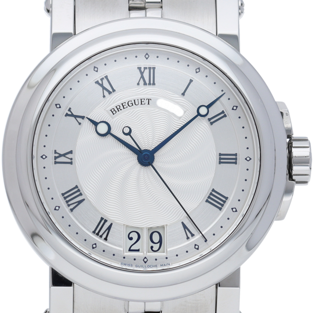 マリーンの名の通り大海を思わせるようなダイヤルのギョーシェ彫り。ブレゲらしい針やインデックス、コインエッジケースなど 同ブランドの魅力がたっぷり詰め込まれた1本です。ビッグデイトの採用により、更なる高級感を醸し出しています。