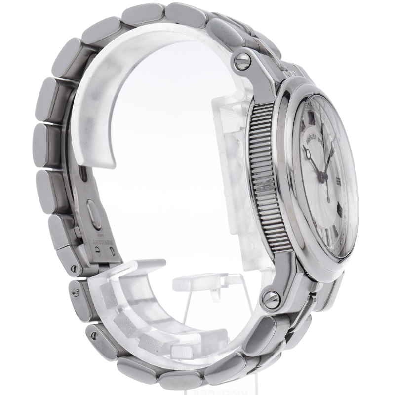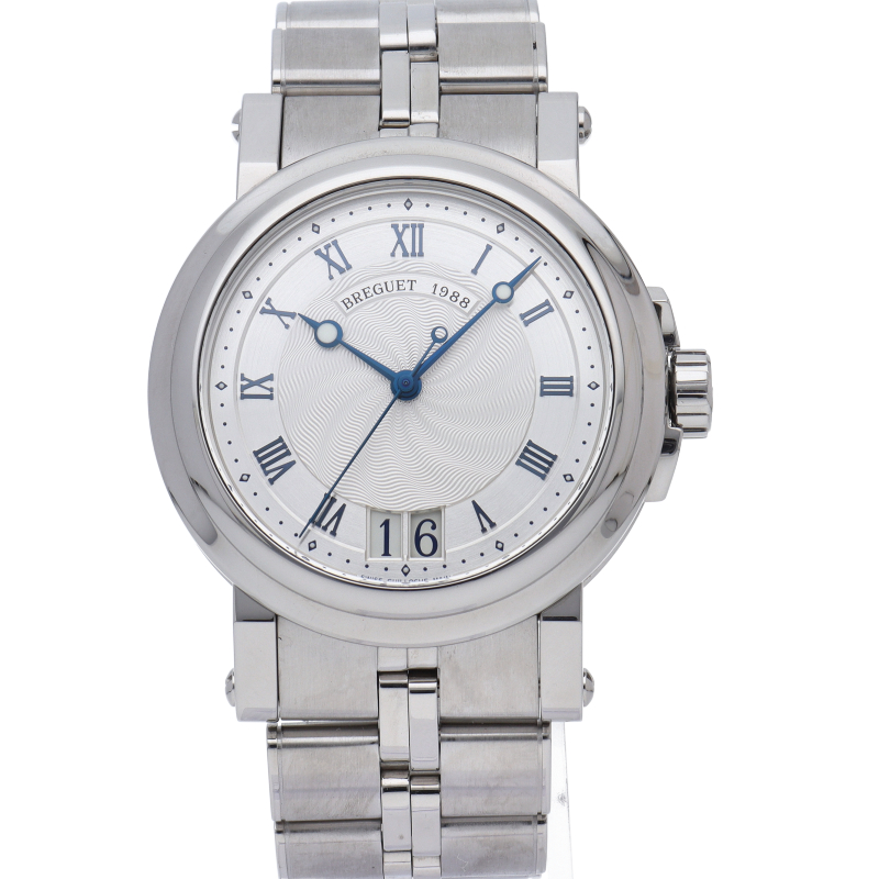 マリーンの名の通り大海を思わせるようなダイヤルのギョーシェ彫り。ブレゲらしい針やインデックス、コインエッジケースなど 同ブランドの魅力がたっぷり詰め込まれた1本です。ビッグデイトの採用により、更なる高級感を醸し出しています。