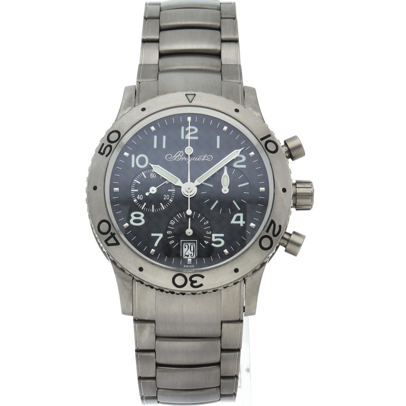 ブレゲの人気パイロットウォッチ「トランスアトランティック」。フライバック機能付クロノグラフ・デイト表示機能搭載で機能性やデザイン性に富んだ1本。