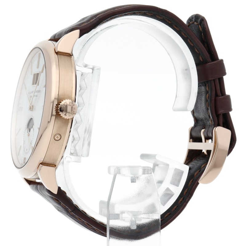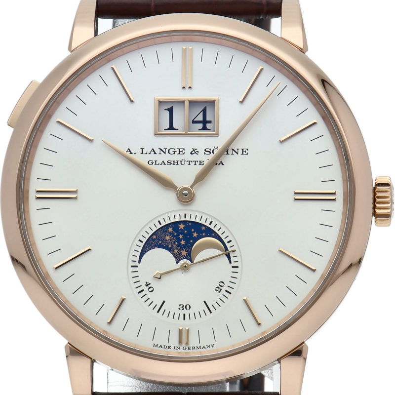 サクソニア・ムーンフェイズには、ランゲ独自のアウトサイズデイトと高精度ムーンフェイズ表示という、おなじみの複雑機構が二つ統合されています。このピンクゴールドモデルのシルバーカラーのダイヤルは、シルバー無垢製です。