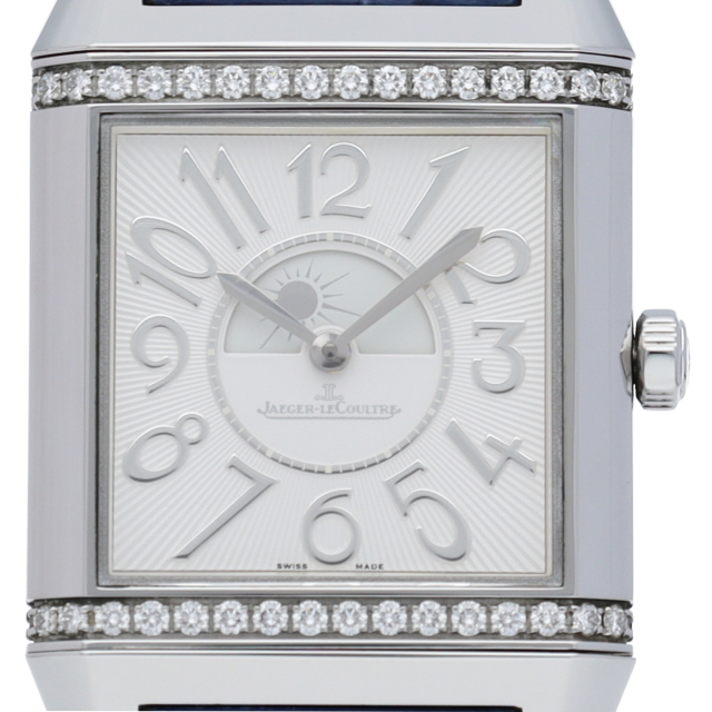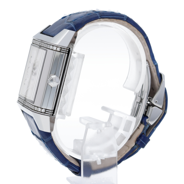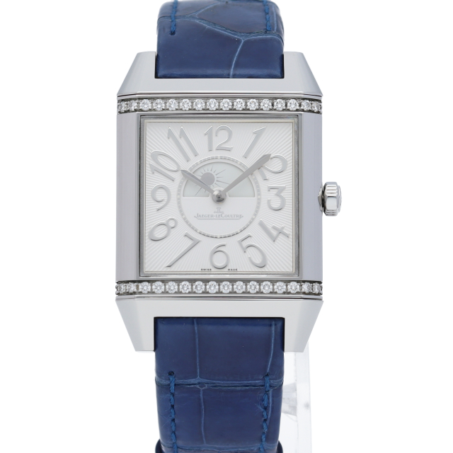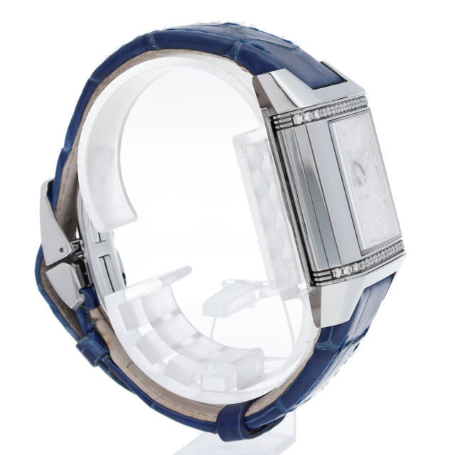 ジャガー・ル・クルトの象徴として有名なモデル「レベルソ」です。ケースの上下にダイヤモンドがセッティングされ華やかな雰囲気になっています。洗練されたスポーティーとグラマラスとが完璧なまでに融合された、現代のアクティブな女性に相応しい時計です。