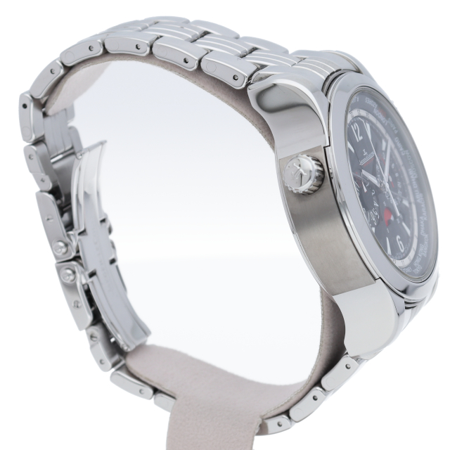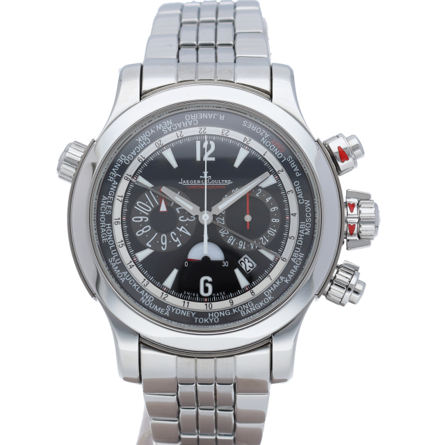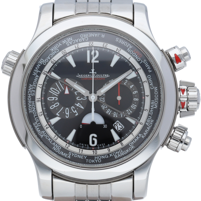 ジャガールクルトのマスター・エクストリームラインにカテゴライズされるマスターコンプレッサーシリーズのワールドクロノグラフモデルです。特許取得済の圧縮キー付きリューズは、従来のネジ込み式リューズより最適な防水性が確保されているのが特徴です。"