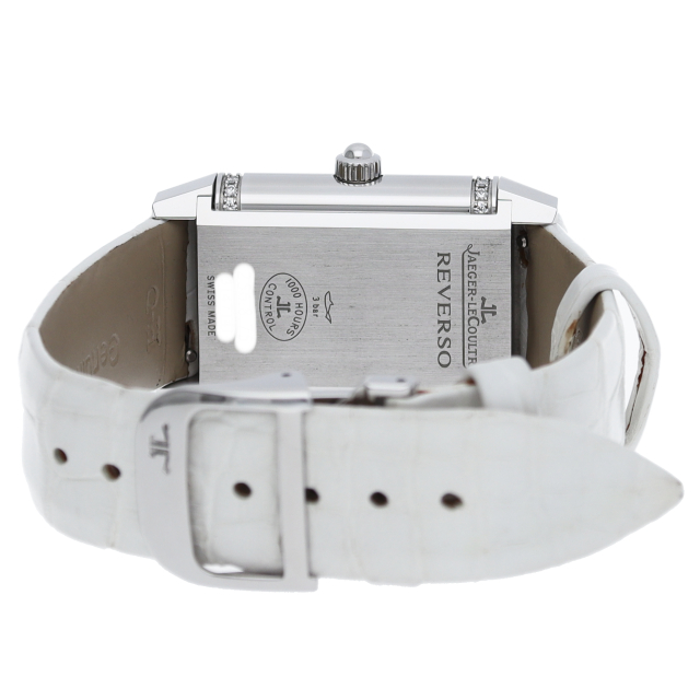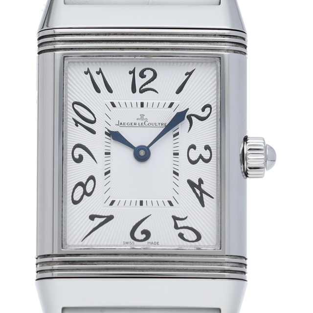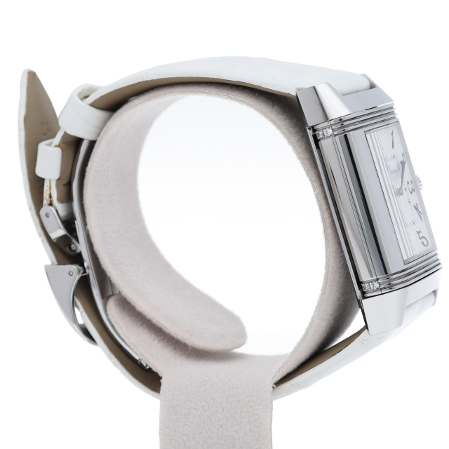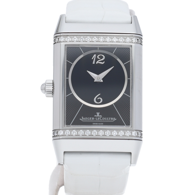 ジャガー・ルクルトを代表する人気モデル「レベルソ」。2つの文字盤を持つため、1本でまるで2本を手にしているようです。昼夜によって、お洋服によって変える楽しみがございます。ベゼルにはダイヤモンドが施された高級感溢れる1本。Q2568402(256.8.75)