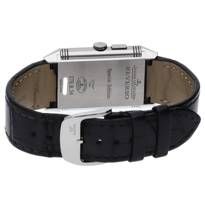 「グランドレベルソ ウルトラスリム デュオ」は、1931年に発表されたオリジナルモデルのデザインを継承したモデルです。僅か9.14mmのスリムケースに搭載されるのは、自社製手巻きムーブメントCal.854/1。表のダイアルに時、分、秒を表示し、裏のダイアルに第2時間帯とデイ/ナイトを表示します。