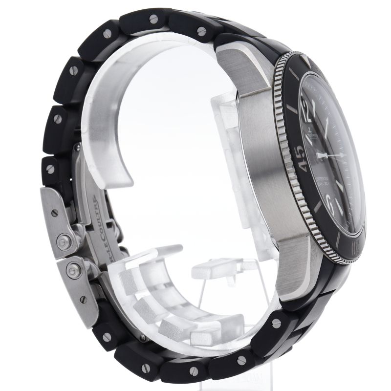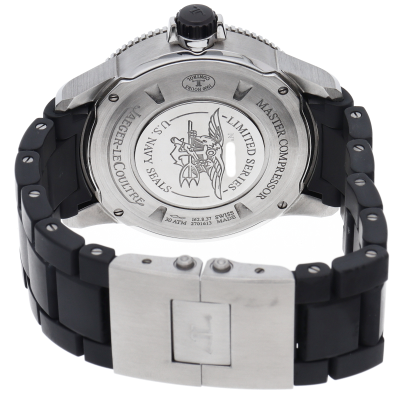 1965年のメモボックスダイバーズウォッチから着想を得た「マスターコンプレッサーコレクション」。こちらはジャガー・ルクルトとアメリカ海軍の特殊部隊“ネイビー・シールズ”が共同開発した世界で1500本限定のモデルです。裏蓋中央にはイカリ、トライデント、銃を掴んだハクトウワシのエンブレムと限定のナンバリングが刻印されています。30気圧防水を備えた、視認性の高いスポーツウォッチです。