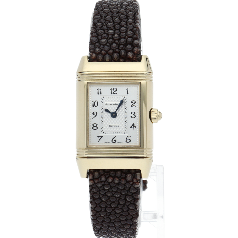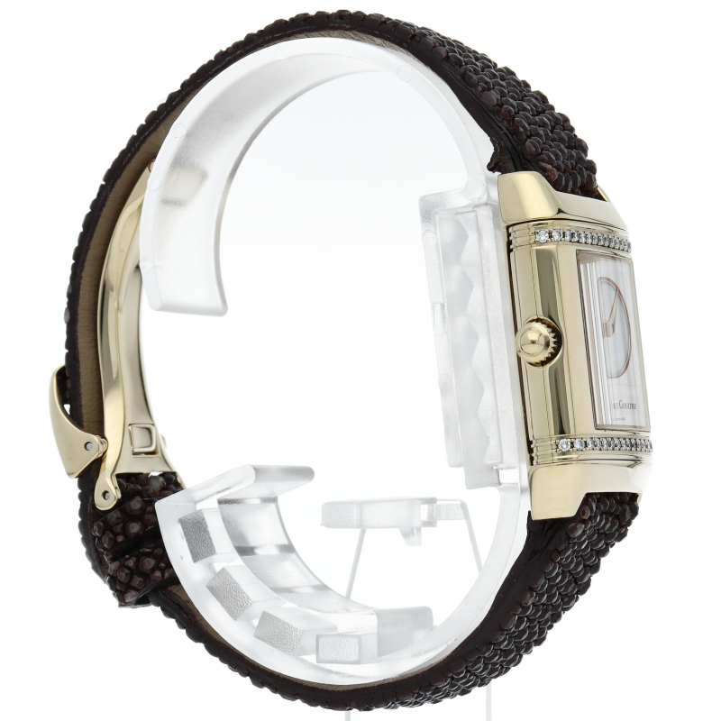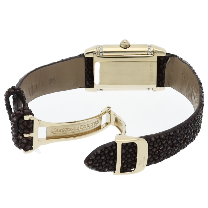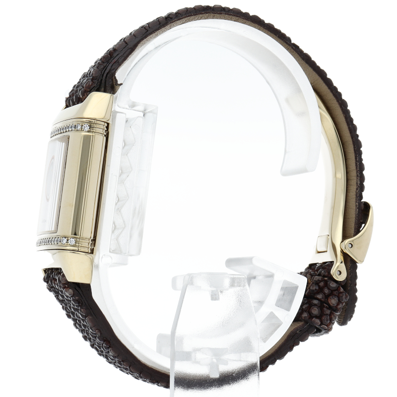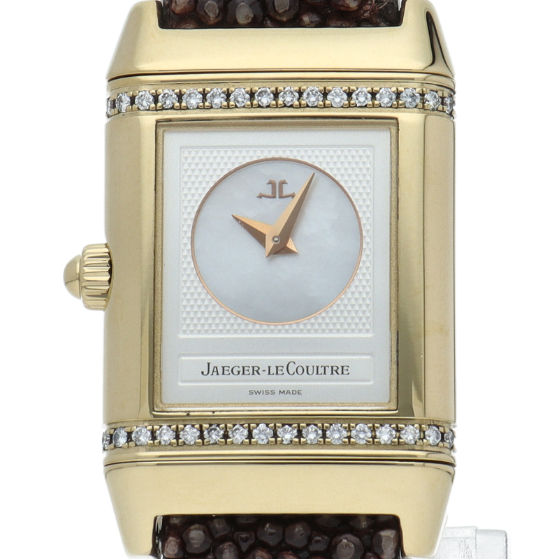 角型時計の代名詞であるレベルソの女性用モデル。表側のクラシックなデザインに対して、裏側は文字盤にシェルを使い、上下にダイヤをセットした華やかなデザインと、2つの異なる雰囲気を楽しめます。