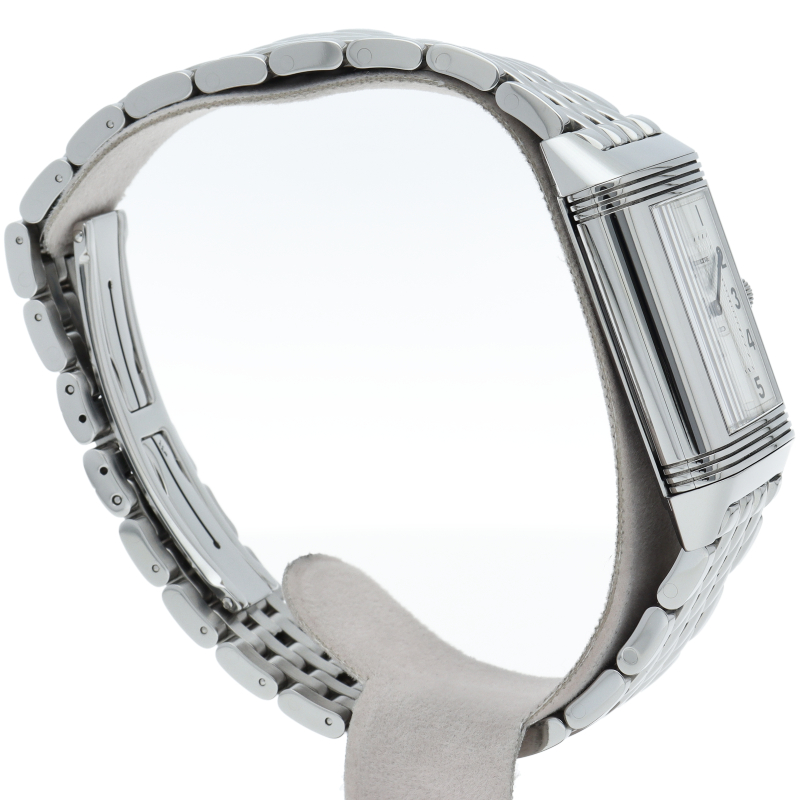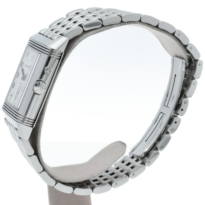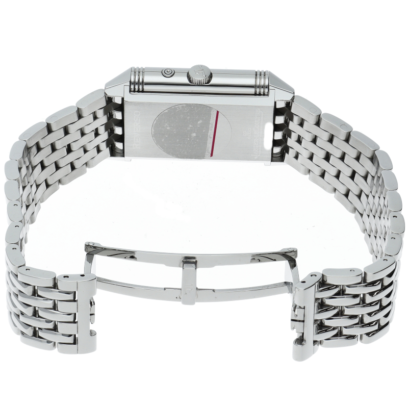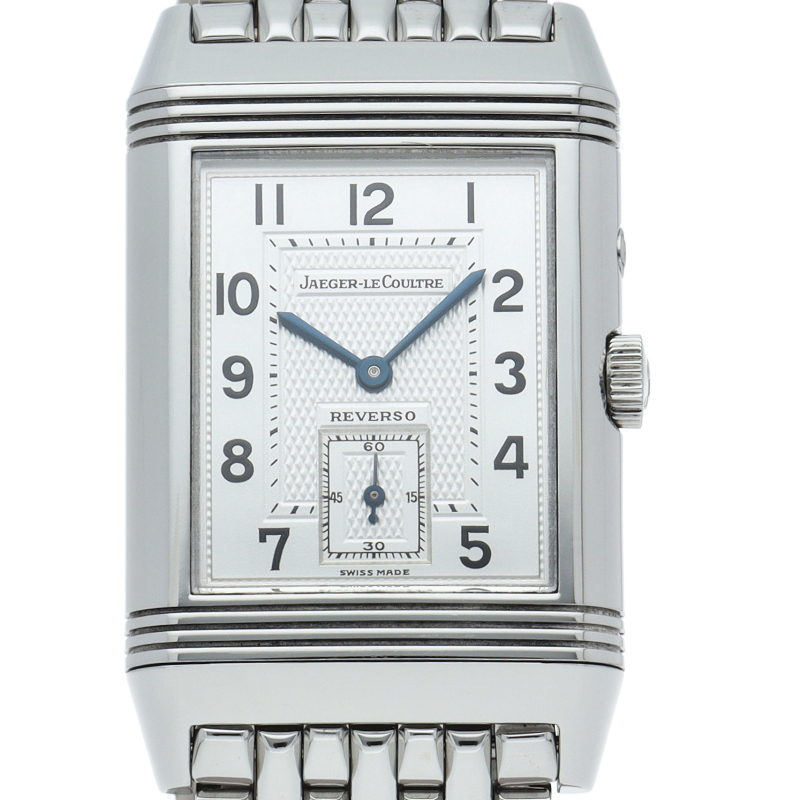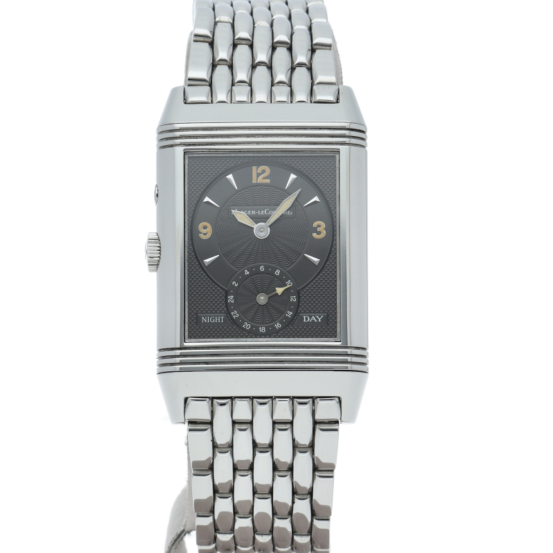 ジャガー・ルクルトを代表する人気モデル「グランド レベルソ」。ダイヤルには日付表示、時・分表示、スモールセコンドが裏ダイヤルには第二時間帯表示、デイ&ナイト表示、24時間表が与えられています。