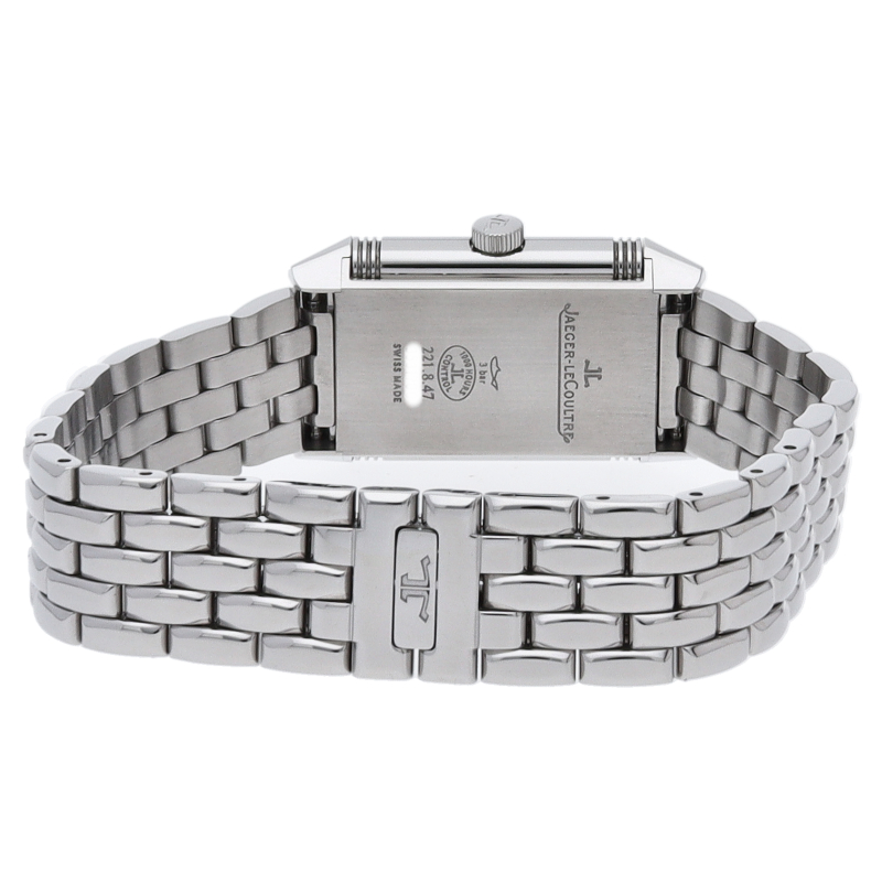 1930年代に誕生したレベルソはポロ競技中にガラスが割れてしまうのを防ぐためにケースを反転させ使用された時計です。こちらのレベルソスモールサイズはレディースモデルとなっており、34mm×21mmの小振りなケースには自社製クォーツムーブメントのCal.657を搭載します。1920~1930年代に流行した幾何学的な図柄のアールデコ様式が取り入れられておりシンプルで飽きの来ない一本です。221.8.47/Q2618140