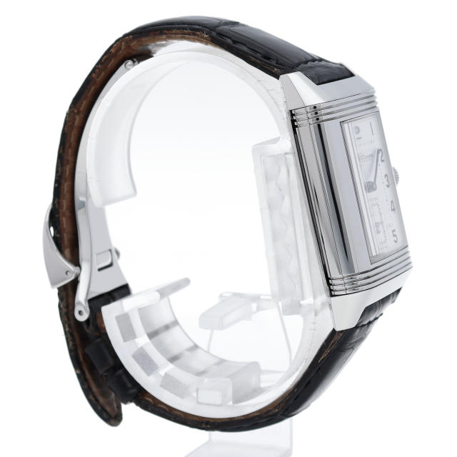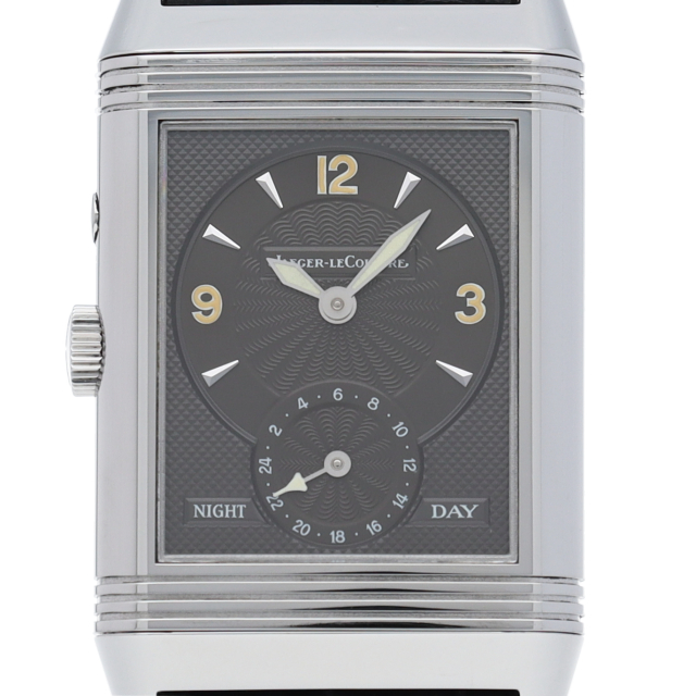 ジャガー・ルクルトを代表する人気モデル「グランド レベルソ」。ダイヤルには日付表示、時・分表示、スモールセコンドが裏ダイヤルには第二時間帯表示、デイ&ナイト表示、24時間表が与えられています。