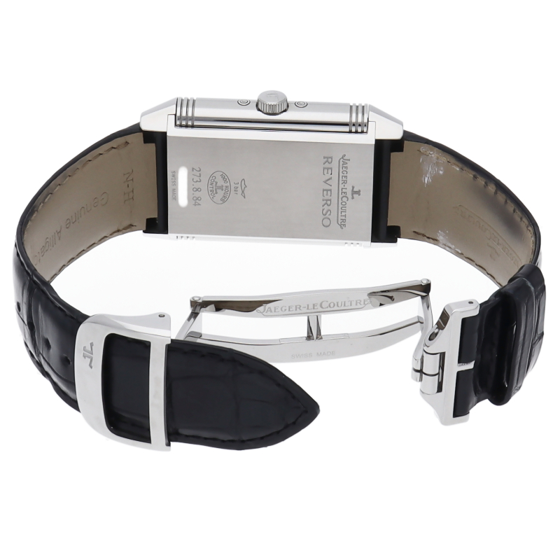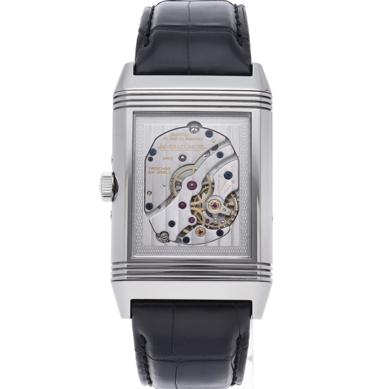 ラテン語で「回転させる」という意味を持つジャガールクルトを代表する定番モデル「レベルソ」。文字盤を反転させることで時計表面のガラスを守るという大変ユニークな作りをしているロングセラーモデルです。こちらのグランド レベルソ カレンダーはデイ・デイト表示、スモールセコンド、ムーンフェイズ表示を備えています。裏面には全面シースルーバックで独特の意匠となる自社製のキャリバー843が見られます。