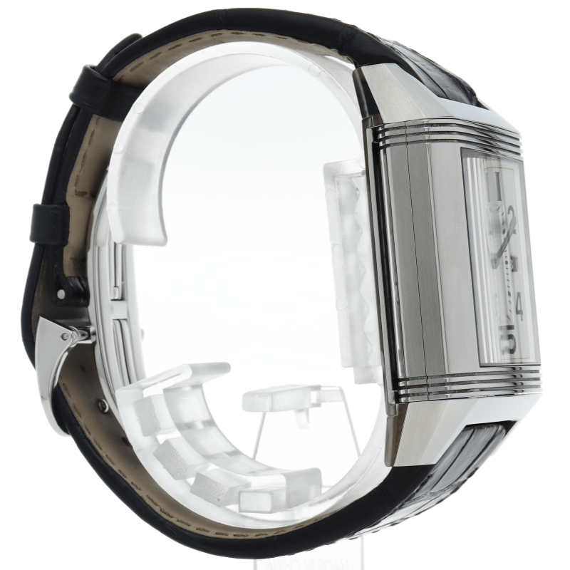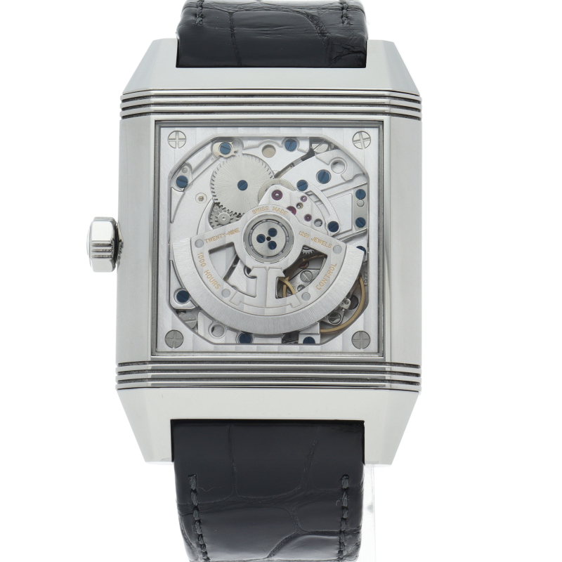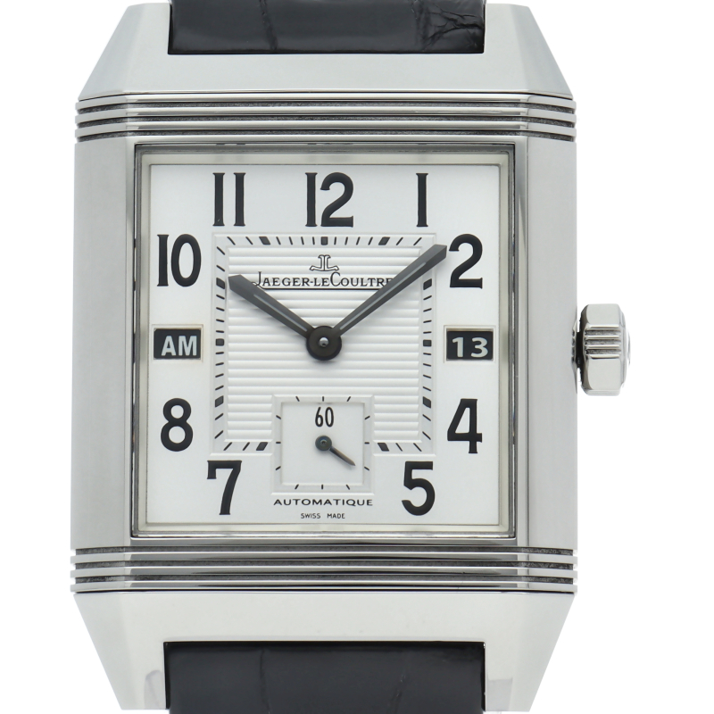レベルソをスクエア型にした「スクアドラ」。GMT機能を搭載しておりホームタイムは黒い針と3時位置の日付で、セカンドタイムは白い針と9時位置のAM/PMで表示します。自社製ムーブメント977搭載。Q7008420/230.8.77