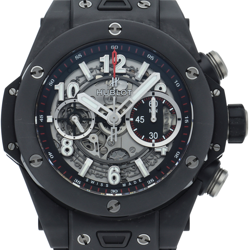 ウブロの自社ムーブメント「ウニコ」を搭載したビッグバンウニコ。45mmの大きなブラックセラミックケースに、ブラックラバーストラップを備え一目でビックバンとわかる特徴的なデザインをした1本です。スケルトン文字盤は非常にインパクトがあり、存在感抜群の腕時計でありながらオールブラックの落ち着いたカラーリングのため、多くのシーンで着用していただけます。