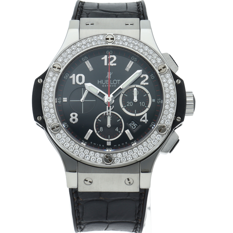 ウブロの大人気シリーズ「ビッグバン」。迫力あるケースサイズに、洗練されたデザインが見るものを圧倒するインパクトを備えております。ベゼルにはダイヤモンドが施された高級感溢れる1本です。