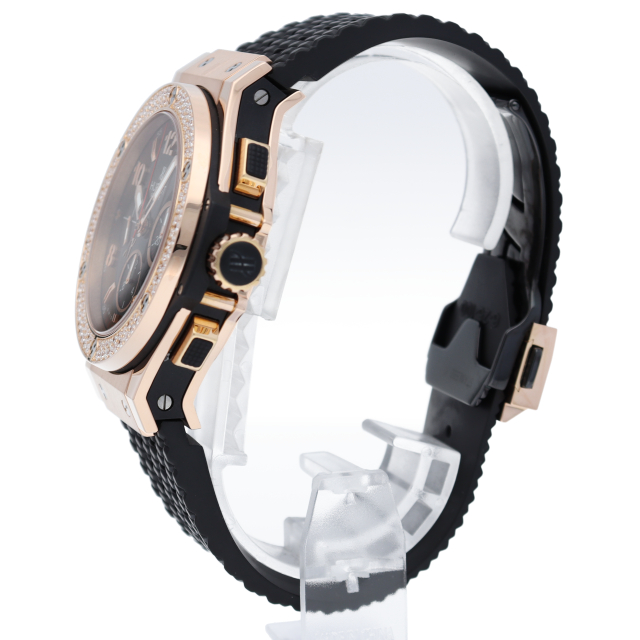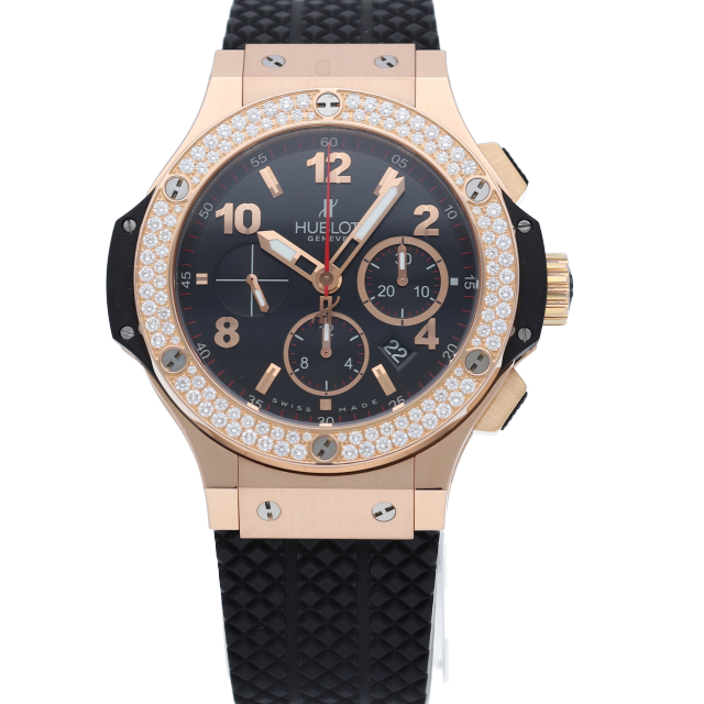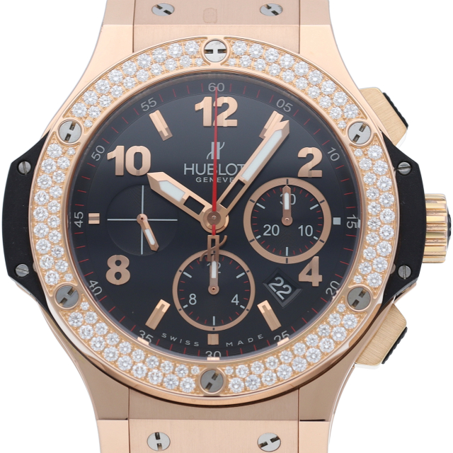 ウブロ不動のフラッグシップモデル「ビッグ・バン」。こちらは44mmのピンクゴールド製ケースのベゼル部分にダイヤモンドを2重でセッティングした豪華なモデルです。