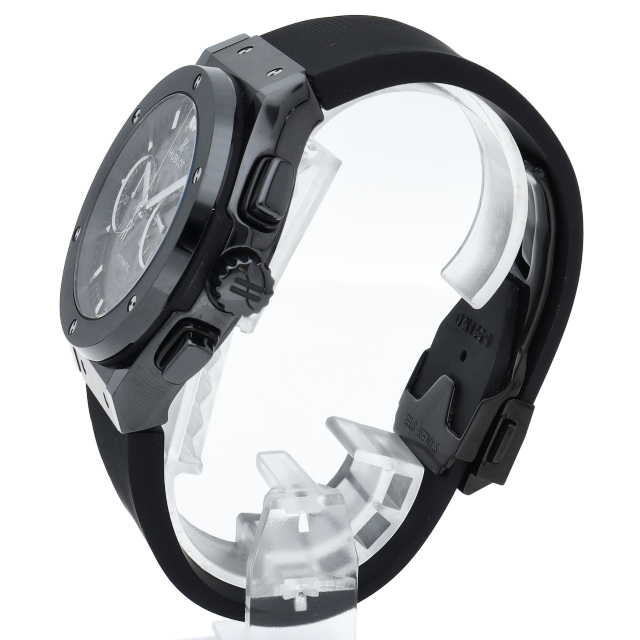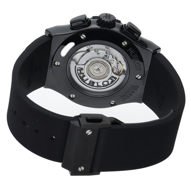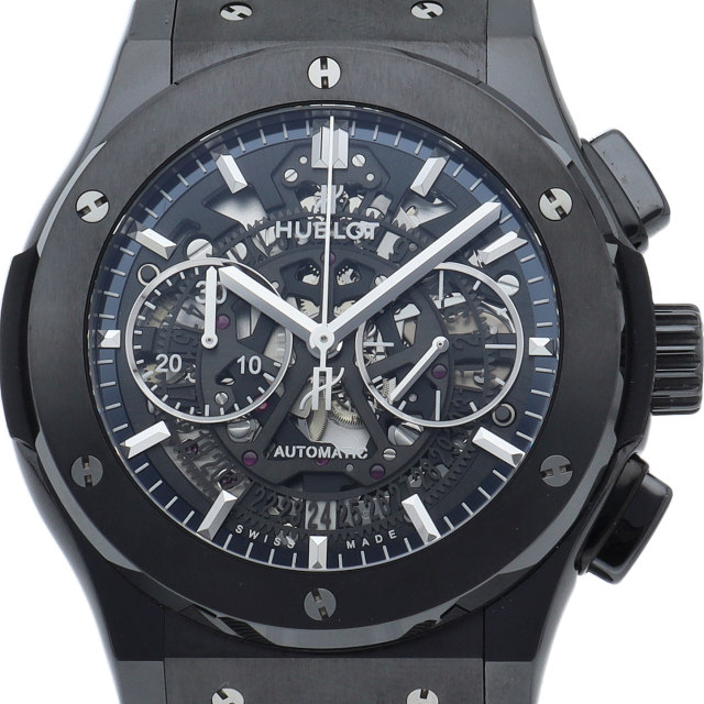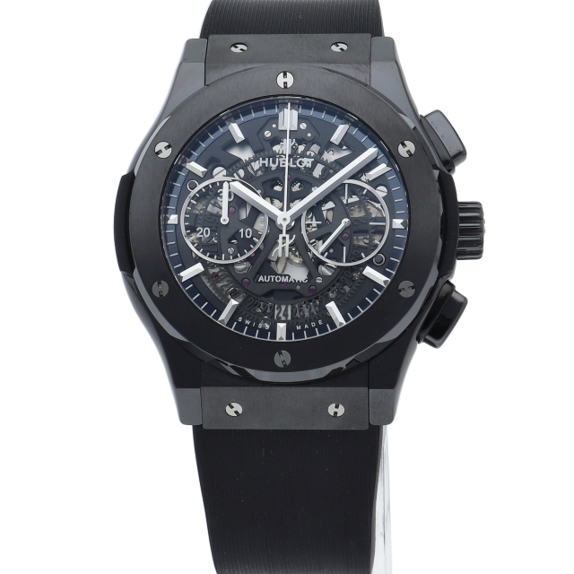 クラシックフュージョンのクロノグラフをスケルトン加工したモデルです。ケースやベゼルにブラックセラミックを使用、文字盤も黒色に統一しています。クラシック フュージョンのシンプルさとウブロらしいメカニカルなデザインが一度に楽しめるお薦めの一本です。ムーブメントにはCal.HUB1155を搭載。50m防水。
