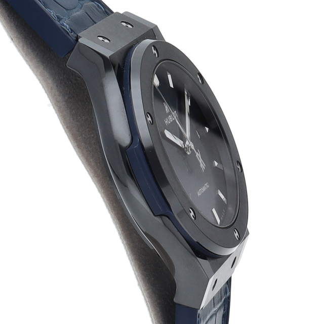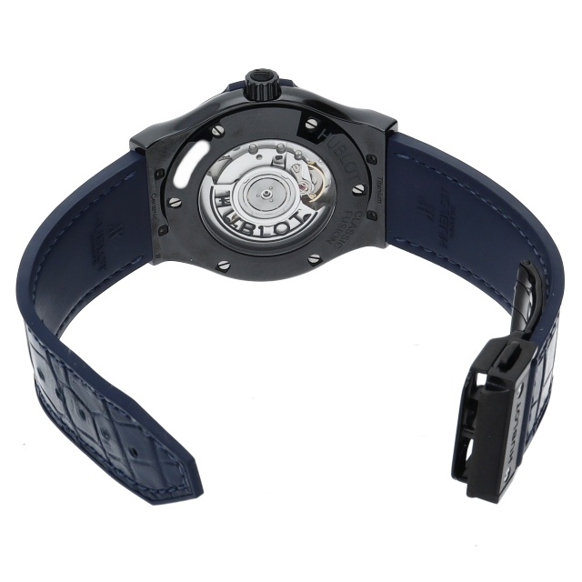 ベゼル部分にセラミック、ケースはジルコニウム、文字盤にカーボンという異素材の融合というコンセプトの元、ウブロの創業より大切にしてきたクラシックを重視した1本。ブラックセラミックケースと爽やかなブルーダイアルは端正なエレガントさとスポーティーな雰囲気を両立しています。