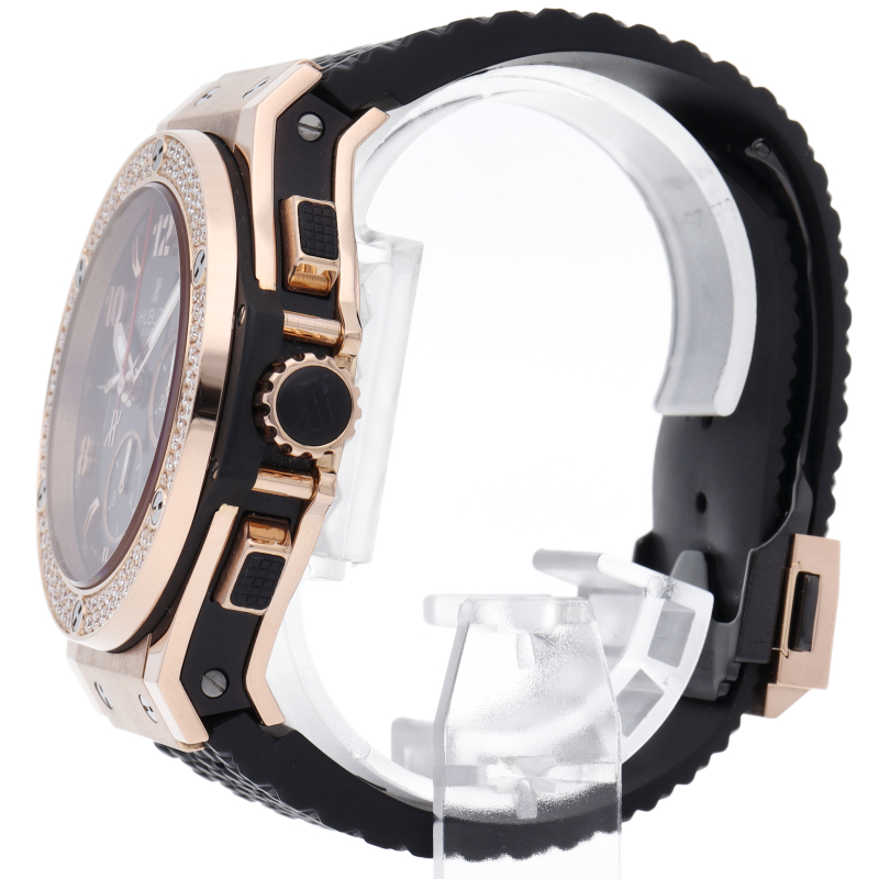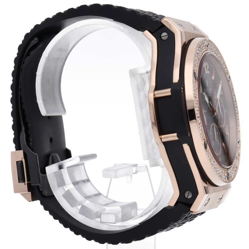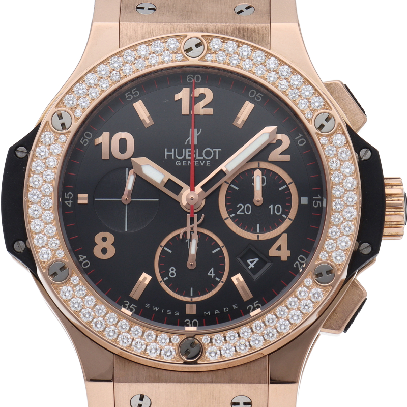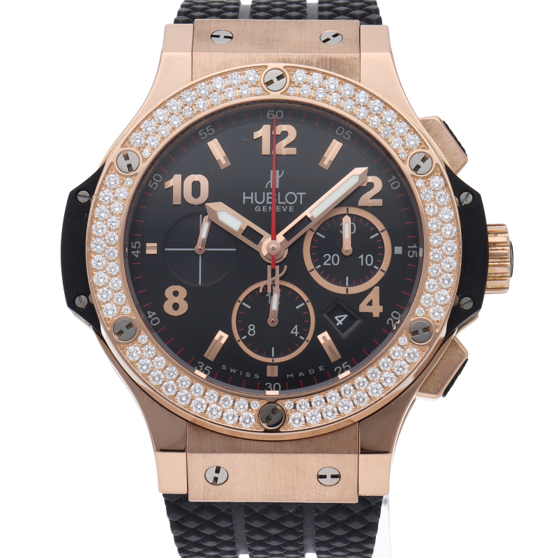 ウブロ不動のフラッグシップモデル「ビッグ・バン」。こちらは44mmのピンクゴールド製ケースのベゼル部分にダイヤモンドを2重でセッティングした豪華なモデルです。