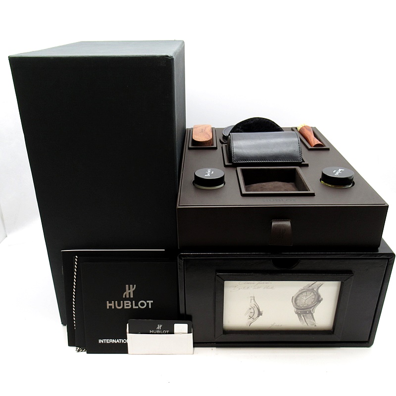 「靴の宝石」と呼ばれるパリのフランスの高級紳士靴ブランド“ベルルッティ”とのコラボレーションモデルです。軽量化と丈夫なウブロのクラシックフュージョンに色合いや肌触りのよいベルルッティが使用する拘りの「ヴェネチアレザー」を文字盤とストラップの表面に使用した世界500本のリミテッドモデルとなります。