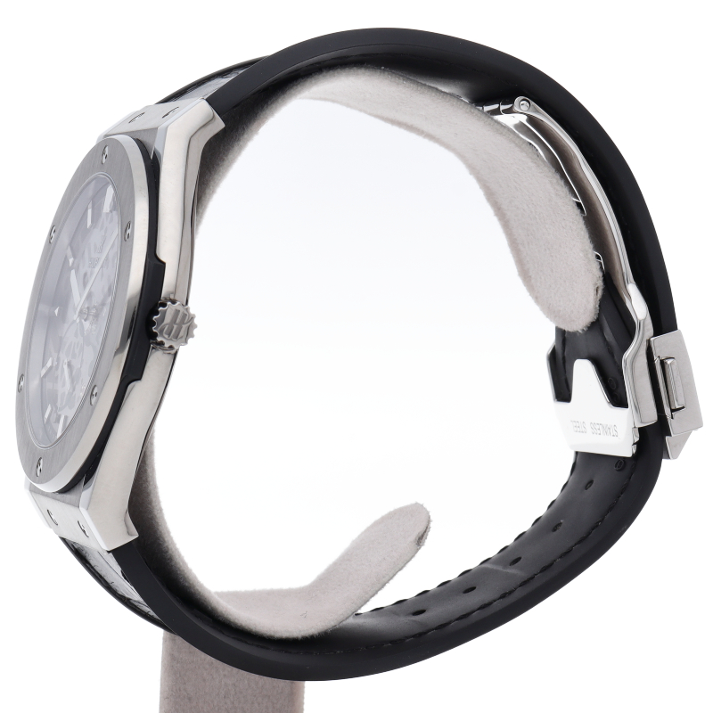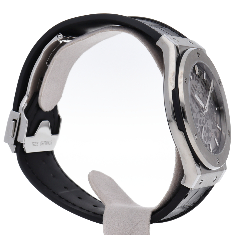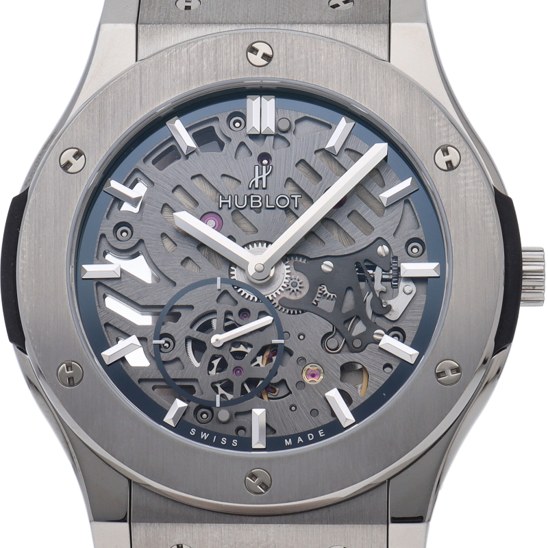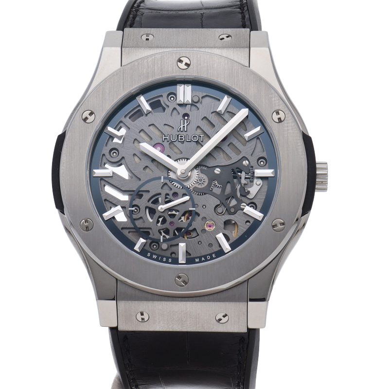 ウブロの原点とも言える代表的モデル「クラシック」。厚さわずか2.9mmの自社開発ムーブメントを搭載したスケルトンモデルです。あえて手巻きムーブメントを採用することにより、そのメカニカルな部分の面白さを強調しています。世界限定1000本。