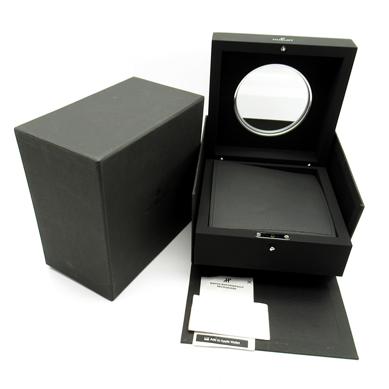 極美品。付属品の保証書はウブロのシステム移行によりEギャランティのため、Eギャランティ登録済みのコピー用紙となります。裏スケルトン。
