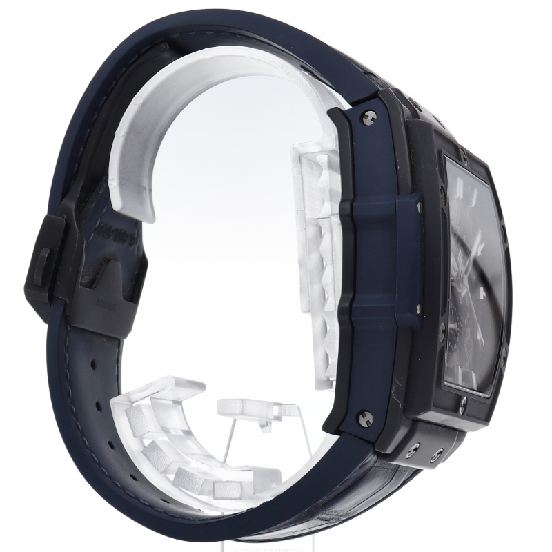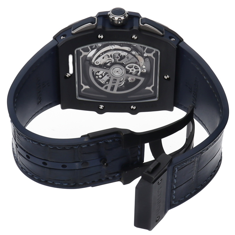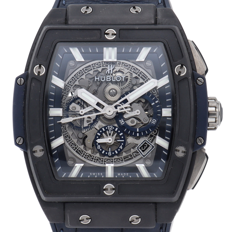ケースとベゼルにマイクロブラスト加工のブラック セラミックを採用した「スピリット オブ ビッグバン」。トノー型のダイヤルが特徴のこのコレクションは、視認性の高い日付表示になってます。操作しやすいクロノグラフ・プッシュボタンにリューズ、フィット感のあるラバーベルトが着け心地良く、とても実用性に長けたモデルです。