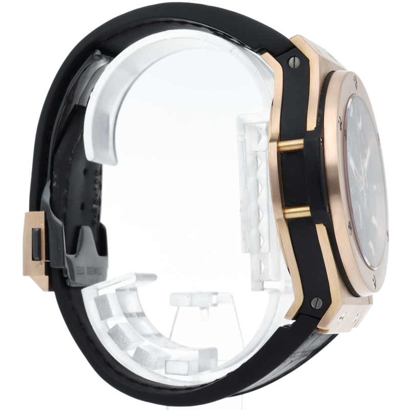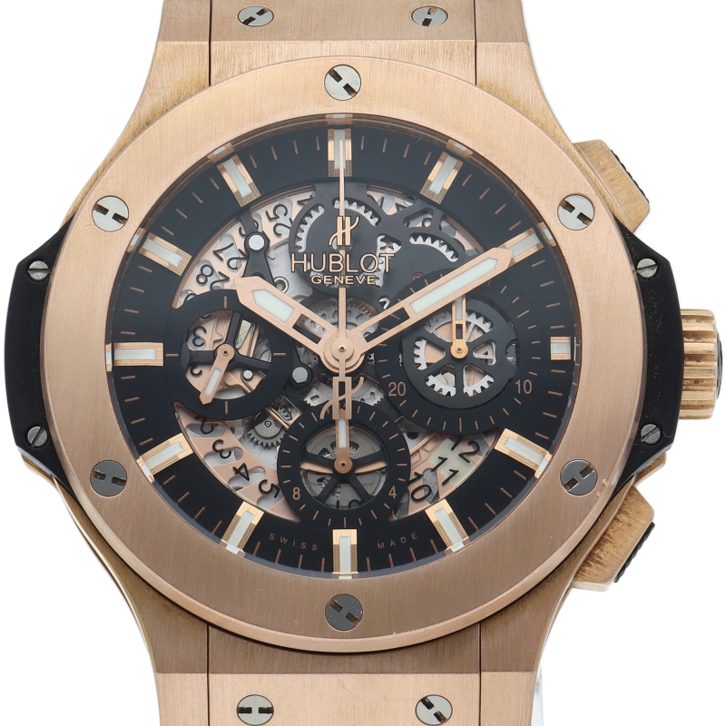 ウブロの大人気シリーズ“ビッグバン”の文字盤をスケルトン化し、内部の機械を直に見えるようにしたのが“アエロバン”です。ダイアルからは歯車の動きや、カレンダーディスクが回る動きなど、その精巧な作りをご覧いただけます。こちらはラジュウペレ社との共同開発ムーブメント「Cal.4214」を搭載したモデルです。