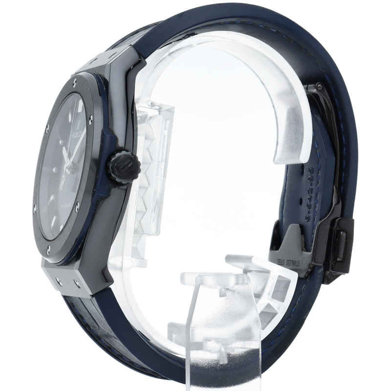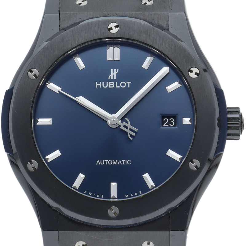 ベゼル部分にセラミック、ケースはジルコニウム、文字盤にカーボンという異素材の融合というコンセプトの元、ウブロの創業より大切にしてきたクラシックを重視した1本。ブラックセラミックケースと爽やかなブルーダイアルは端正なエレガントさとスポーティーな雰囲気を両立しています。