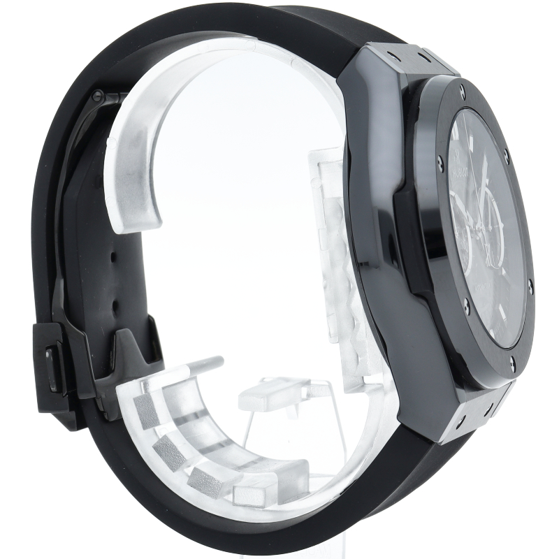 ウブロが創業以来大切にしてきたシリーズ「クラシック」の進化系「クラシック フュージョン」。「クラシックフュージョン アエロクロノグラフ チタニウム」は、クロノグラフムーブメントをスケルトン化したモデルで、こちらはそのブラックマジックモデルです。ケースはブラックセラミック、ダイヤルや針も黒で統一され、迫力バツグンの一本になっています。