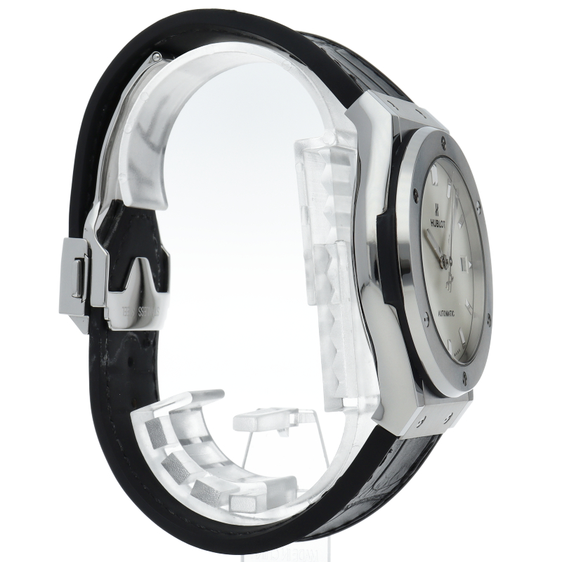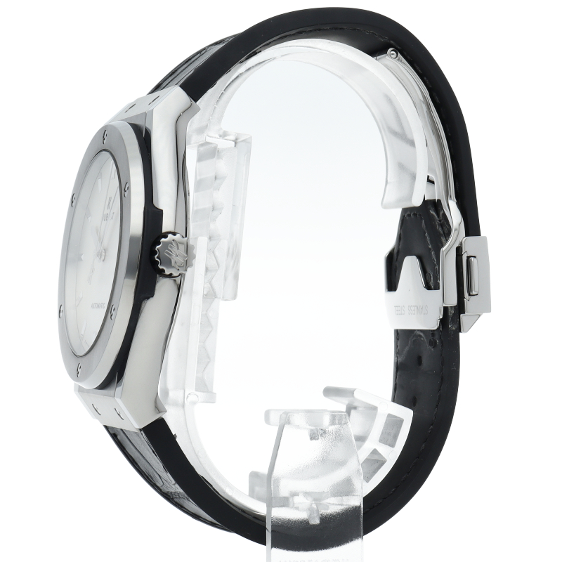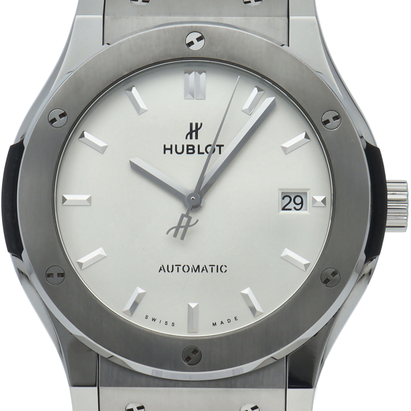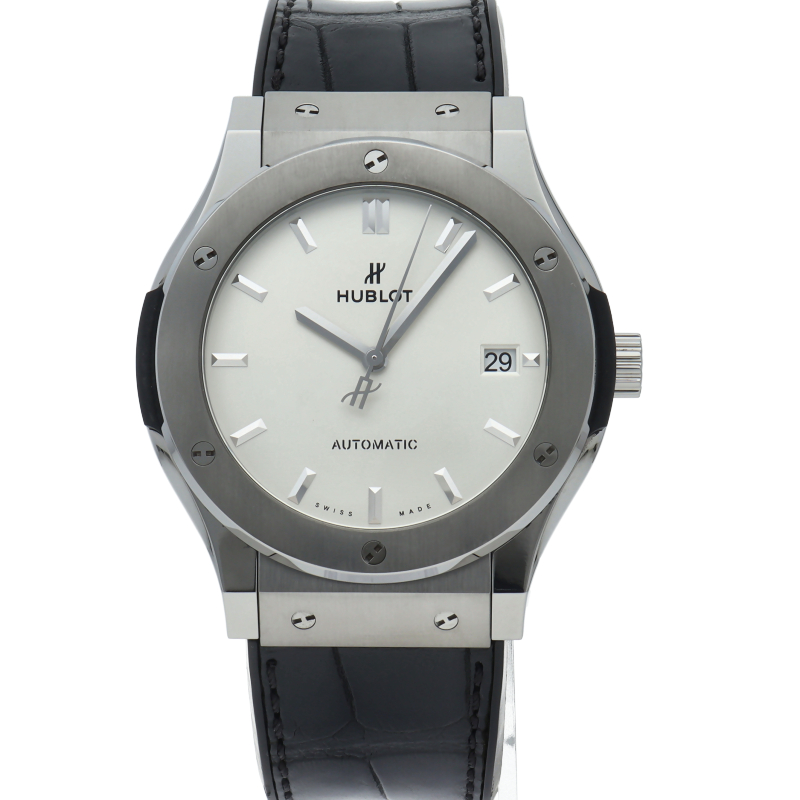 クラシックフュージョンは、ウブロ人気のタイムピース。ビス留めされたシャープな上面をツヤ消し、丸みを帯びた側面を光沢にしたケースや手元でキラリと光を反射させる立体インデックスの仕上げ一つにもブランドステータスを香らせて高級感溢れる手元をつくります。