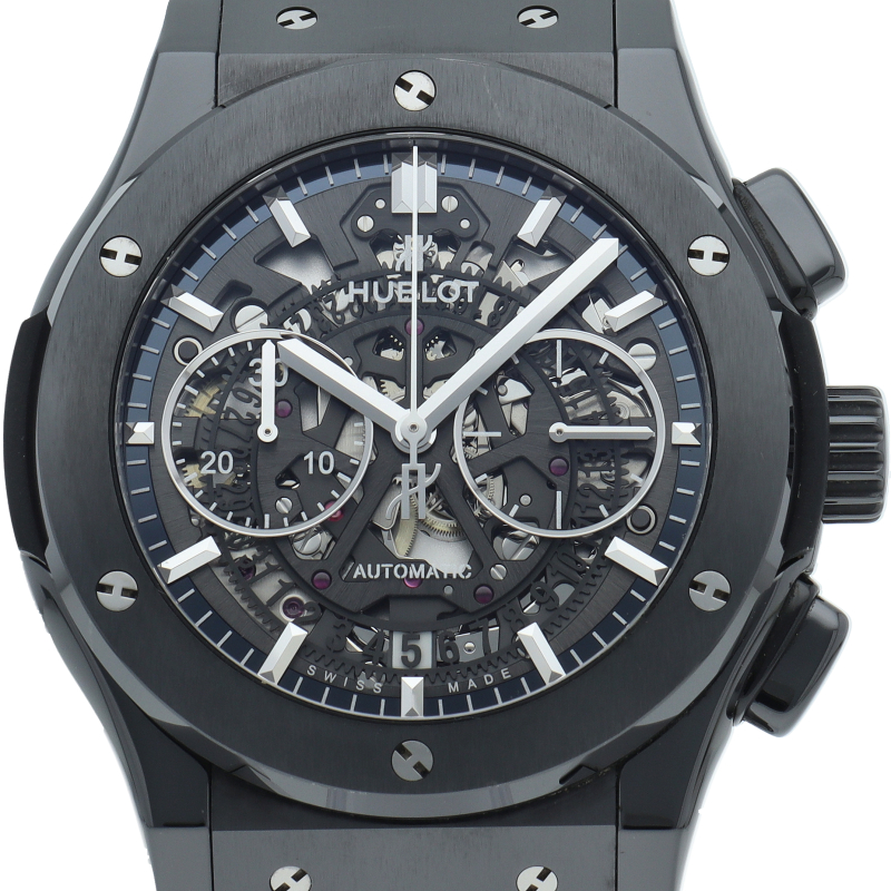 ウブロが創業以来大切にしてきたシリーズ「クラシック」の進化系「クラシック フュージョン」。「クラシックフュージョン アエロクロノグラフ チタニウム」は、クロノグラフムーブメントをスケルトン化したモデルで、こちらはそのブラックマジックモデルです。ケースはブラックセラミック、ダイヤルや針も黒で統一され、迫力バツグンの一本になっています。