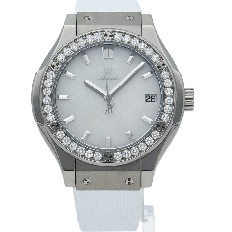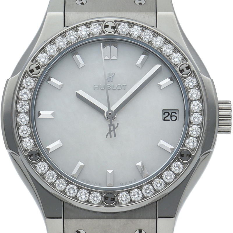 極美品。メーカー純正ダイヤベゼル。付属品の保証書はウブロのシステム移行によりEギャランティのため、Eギャランティ登録済みのコピー用紙となります。