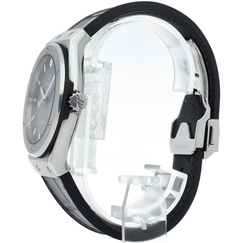 異素材の融合というコンセプトの元、ウブロの創業より大切にしてきたクラシックを重視した1本。シンプルなデザインに薄型ケースのこちらの商品は爽やかでスマートな一本でございます。