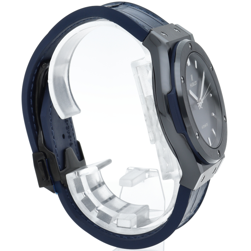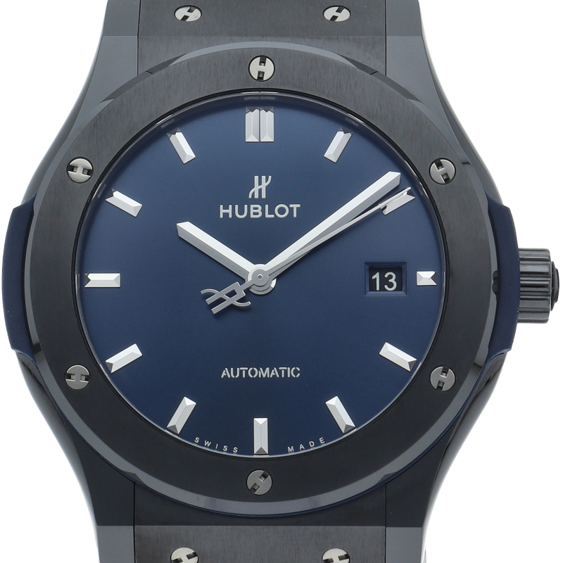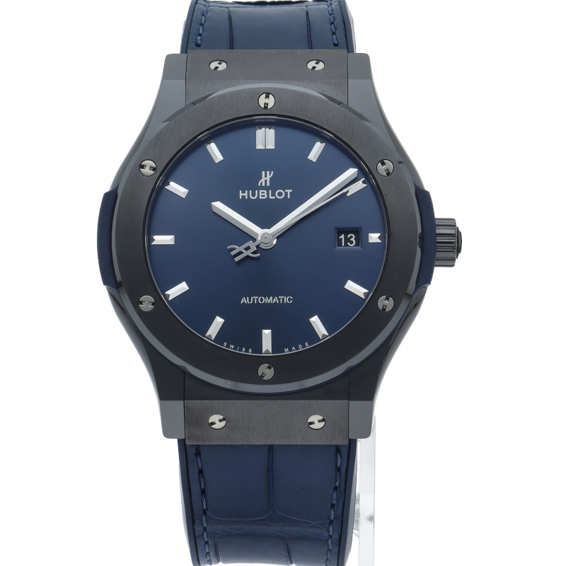 ベゼル部分にセラミック、ケースはジルコニウム、文字盤にカーボンという異素材の融合というコンセプトの元、ウブロの創業より大切にしてきたクラシックを重視した1本。ブラックセラミックケースと爽やかなブルーダイアルは端正なエレガントさとスポーティーな雰囲気を両立しています。