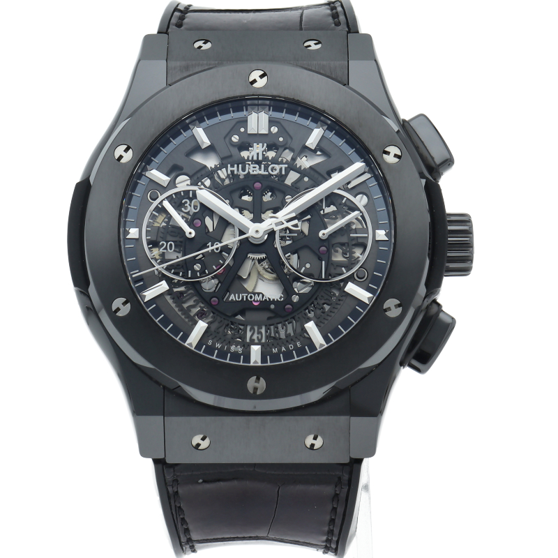 ウブロが創業以来大切にしてきたシリーズ「クラシック」の進化系「クラシック フュージョン」。「クラシックフュージョン アエロクロノグラフ チタニウム」は、クロノグラフムーブメントをスケルトン化したモデルで、こちらはそのブラックマジックモデルです。ケースはブラックセラミック、ダイヤルや針も黒で統一され、迫力バツグンの一本になっています。
