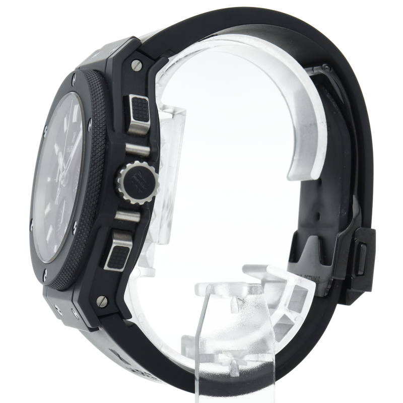 様々な異なる素材を巧みに組み合わせたマルチレイヤー(多層)構造による立体的なケースデザインが特徴のビッグバン・コレクション。こちらはブラックカラーで統一したブラックマジック仕様「301.CI.1770.RX」。セラミックベゼルやケースサイドのグラスファイバー、カーボン製ダイアル、ラバーストラップ、部分的に使用されるチタニウムなど、異素材ミックスがウブロらしい1本です。