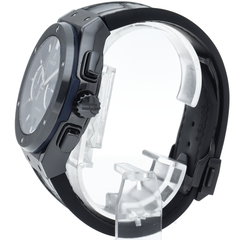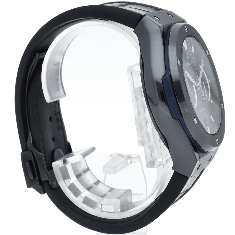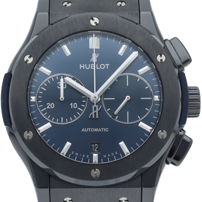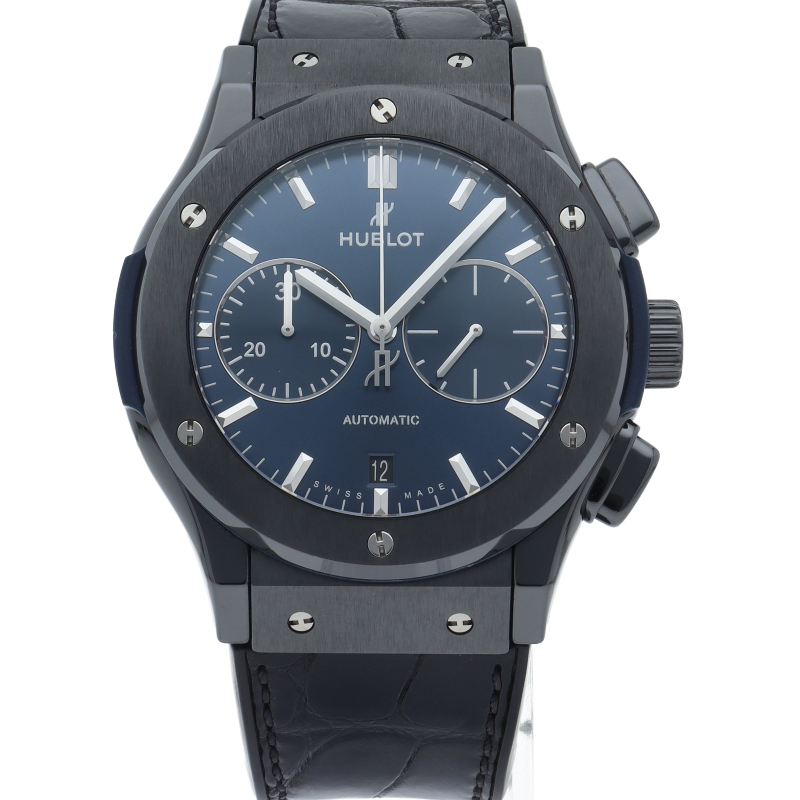 ブラックセラミックケースにブルーのコントラストが高級感を演出しています。シンプルでありながら、ウブロの持つ洗練された印象を鮮やかに表現。