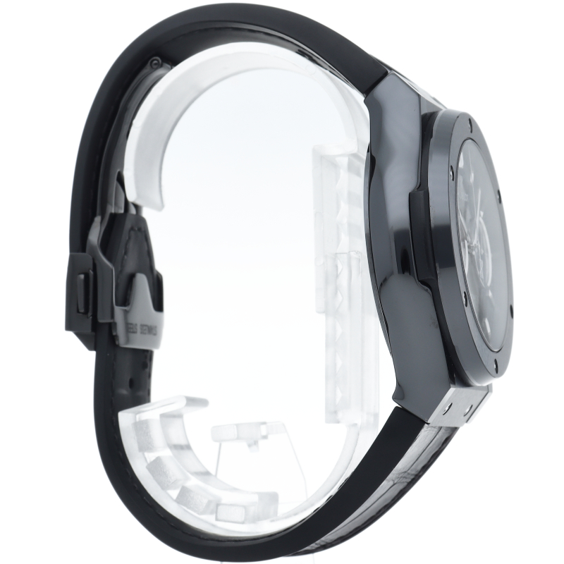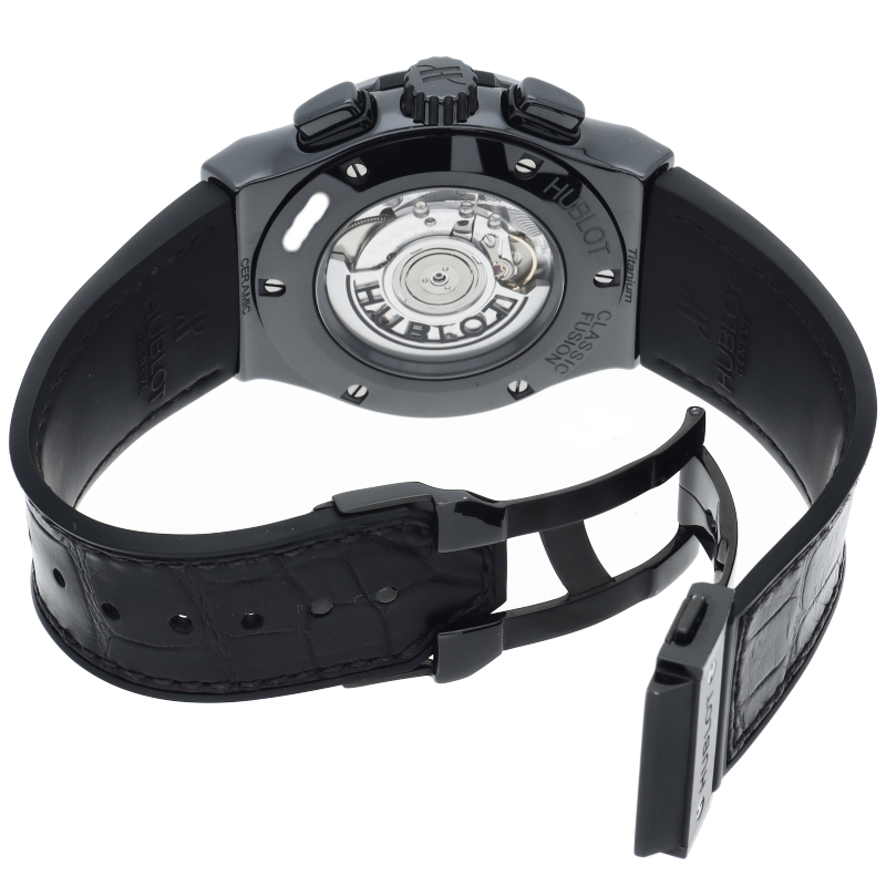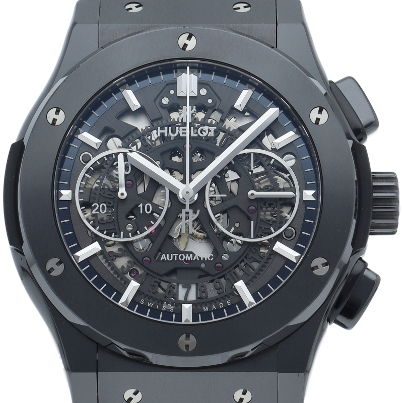 ウブロが創業以来大切にしてきたシリーズ「クラシック」の進化系「クラシック フュージョン」。「クラシックフュージョン アエロクロノグラフ チタニウム」は、クロノグラフムーブメントをスケルトン化したモデルで、こちらはそのブラックマジックモデルです。ケースはブラックセラミック、ダイヤルや針も黒で統一され、迫力バツグンの一本になっています。
