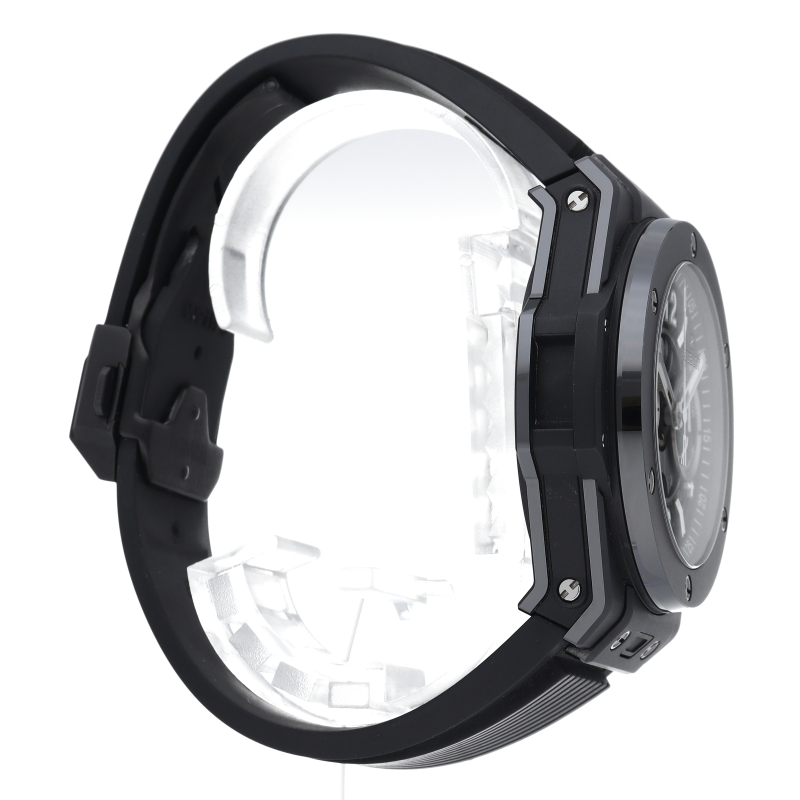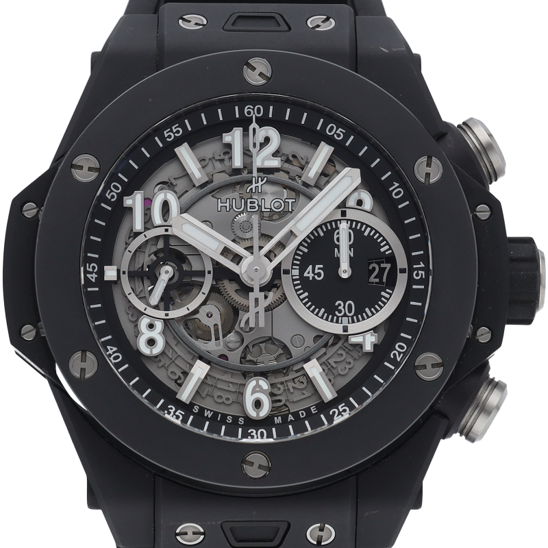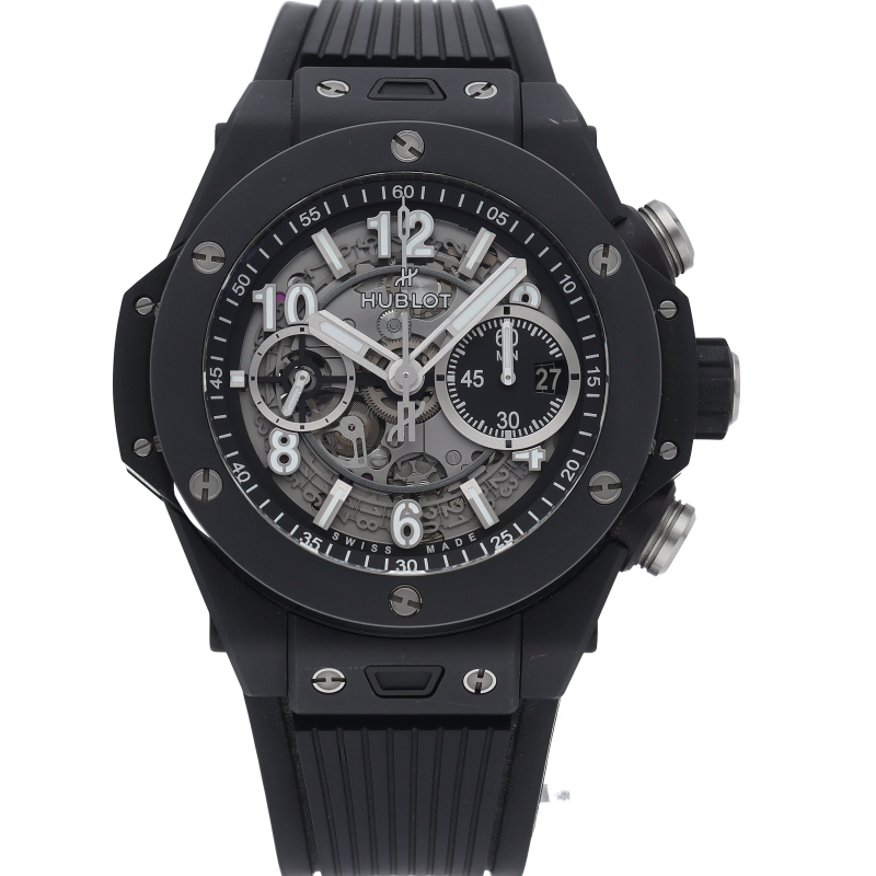 ウブロの自社ムーブメント「ウニコ」を搭載したビッグバンウニコ。45mmの大きなブラックセラミックケースに、ブラックラバーストラップを備え一目でビックバンとわかる特徴的なデザインをした1本です。スケルトン文字盤は非常にインパクトがあり、存在感抜群の腕時計でありながらオールブラックの落ち着いたカラーリングのため、多くのシーンで着用していただけます。