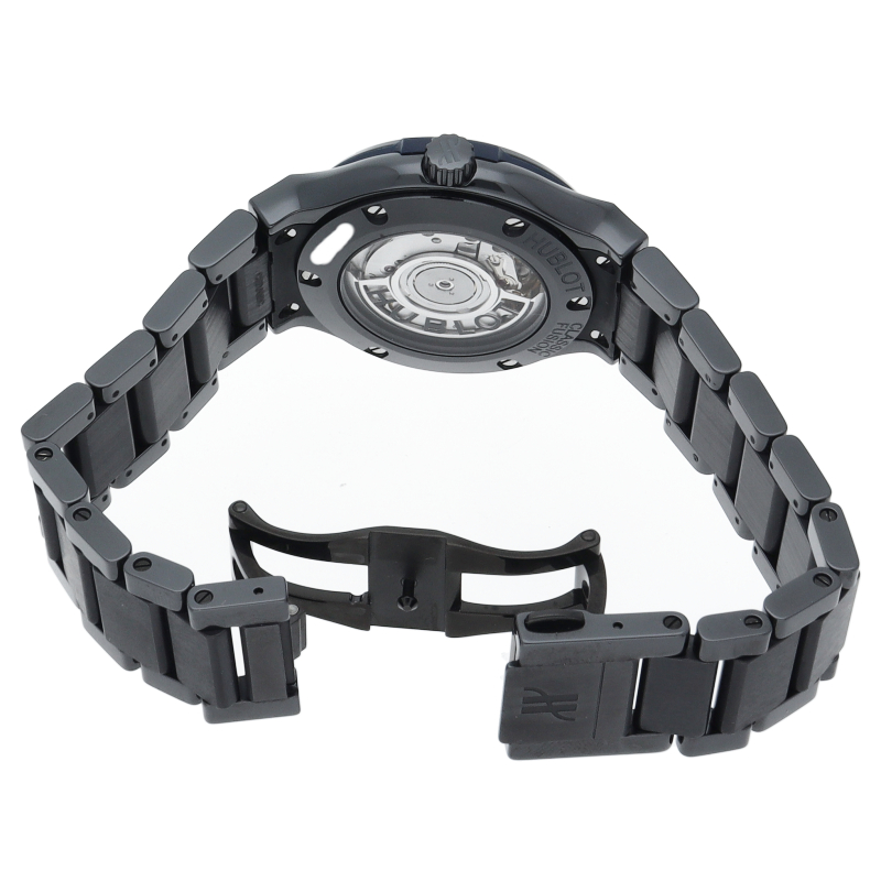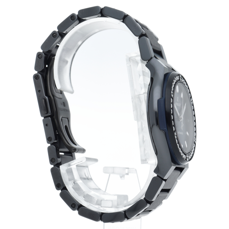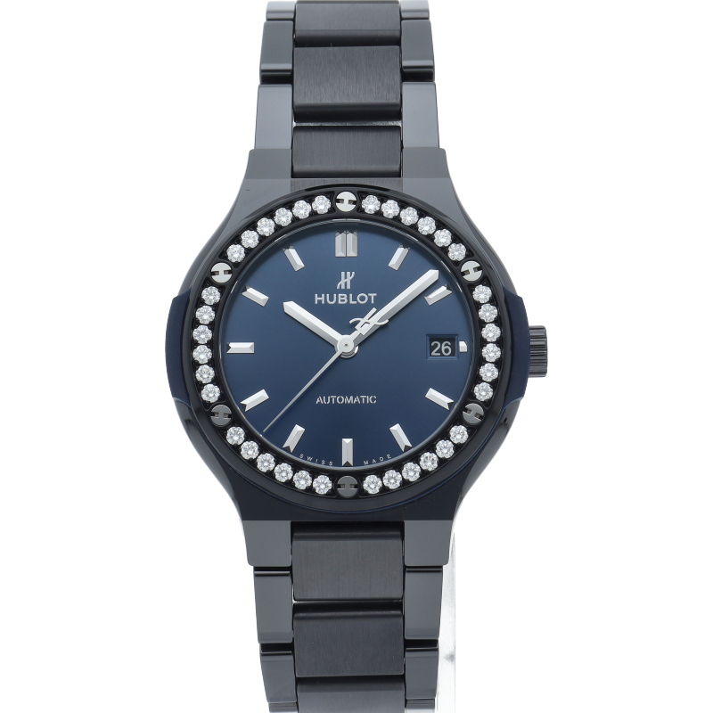 ウブロ「クラシック・フュージョン」。傷に強いブラックセラミックの38mmケースに、美しいブルー文字盤と煌めく純正ダイヤモンドベゼルを合わせた自動巻きモデルです。都会的で洗練されたデザインはユニセックスでお使いいただけます。中古市場でも注目度が高く、極上のラグジュアリーを求める方に強くおすすめしたい逸品です。