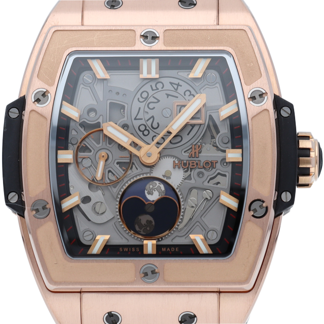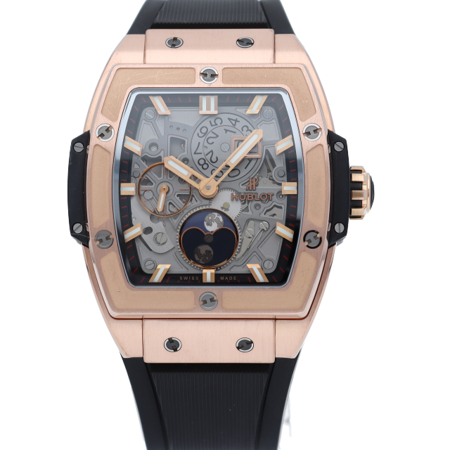 こちらは、ウブロ スピリット・オブ・ビッグバン ムーンフェイズ キングゴールド「647.OX.1138.RX」です。自社製自動巻きキャリバー1770を搭載し、ビッグデイトとムーンフェイズ表示機能を装備したニューモデルとなります。
