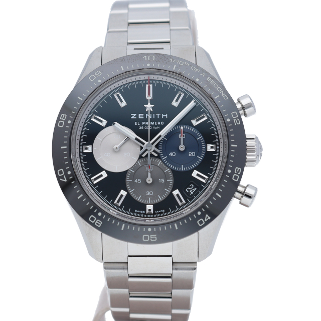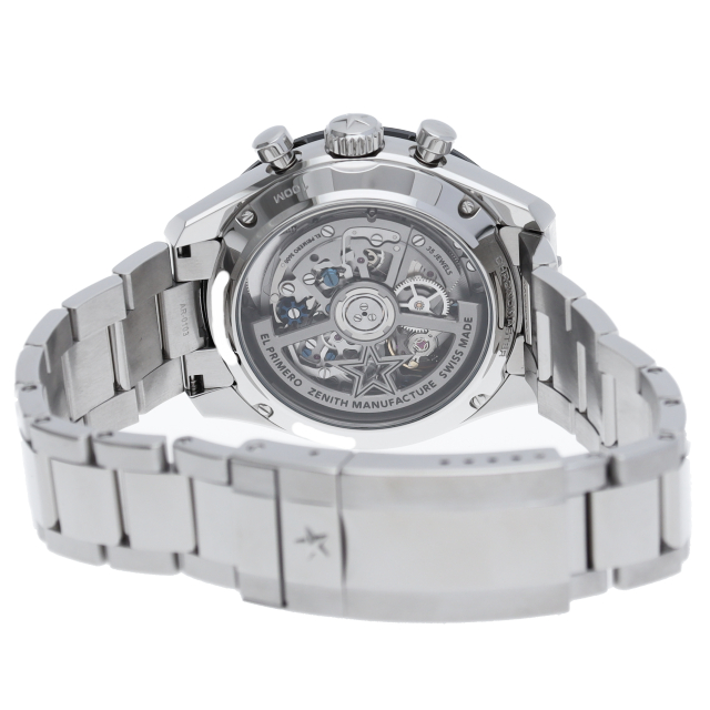 クロノマスター スポーツは、3色文字盤、ポンプ型のプッシュボタン、スチール製ブレスレットとセラミック製のブラックベゼルなど、過去のゼニス クロノグラフの要素を現代的な41mmケースに組み込んでいます。このバージョンには、ブラックの文字盤と一体型のスチール製ブレスレットが付属しています。