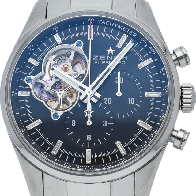 1969年発表の初代エル・プリメロをイメージした色使いに、現代のゼニスのシンボルであるダイヤルをくりぬいた「窓」を融合させた「エルプリメロ クロノマスター オープン」。こちらはインデックスにダイヤが施された大阪ブティック20本限定となります。