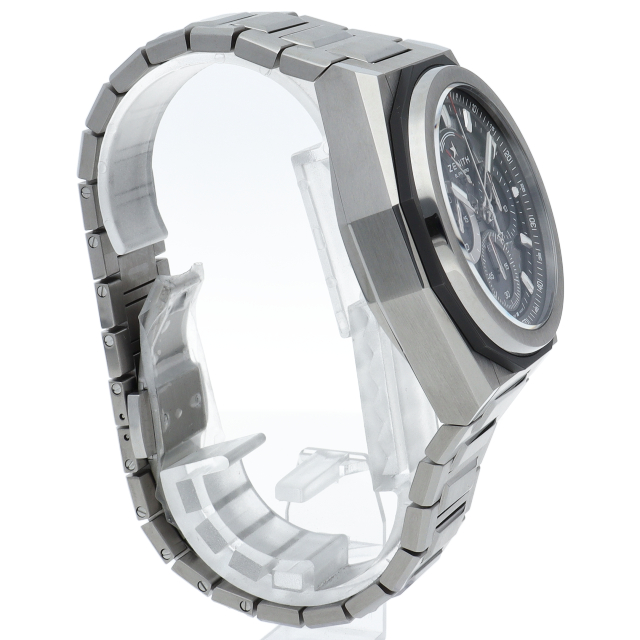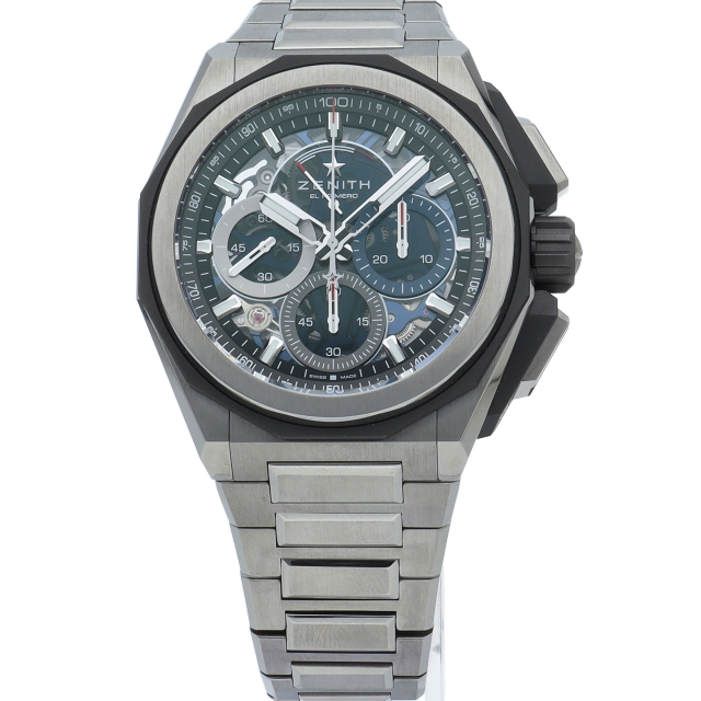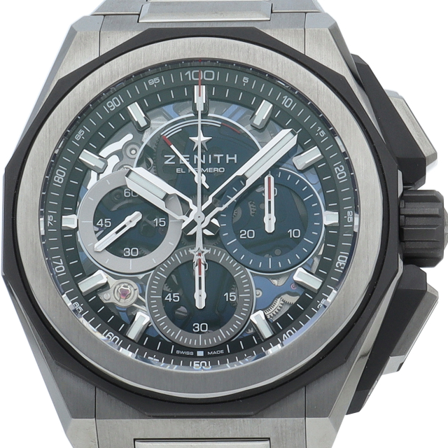 ゼニスが誇る10振動クロノグラフムーブメントのエル・プリメロを搭載した「デファイ エクストリーム」。エルプリメロの持つ36000振動を最大限に活かした1/100秒クロノグラフモデルとなり、センターに設けられたクロノ秒針は1秒で1回転します。3時位置には30分積算計、6時位置には60秒カウンター、そして9時位置はスモールセコンドの配置となります。