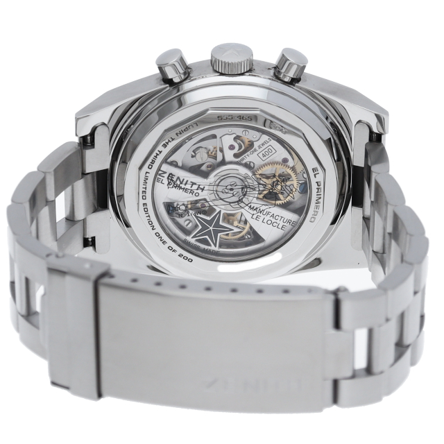 日本のアニメと漫画シリーズ「ルパン三世」に初めて登場したゼニスのエル・プリメロからインスピレーションを受けて作られた限定200本モデル。裏蓋の次元大介も大きなポイントです。