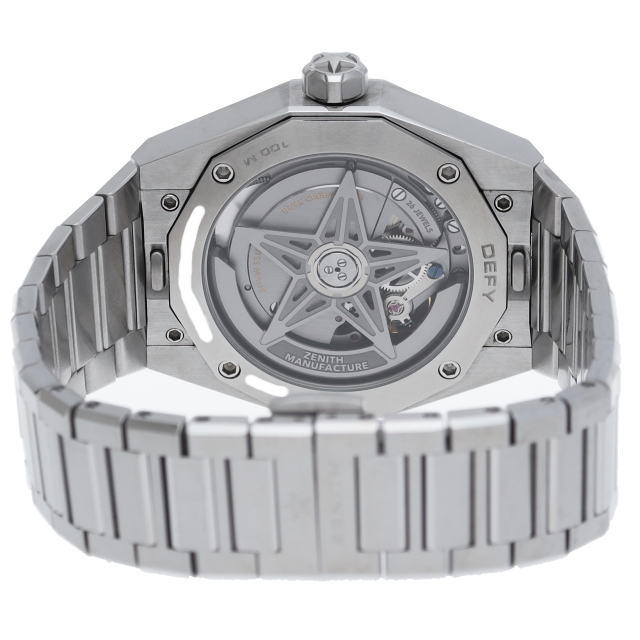 「デファイ スカイライン」では、ファセットカットのベゼルを配した41mmスチール製の八角形のケースを使用し、ブルートーンのサンバースト仕上げを施した文字盤にはゼニスの象徴である4つの点を結んだ星を復刻させてあしらっています。1/10秒精度を誇る初のインジケーターを備えた高振動エル・プリメロ 3620自動巻クロノグラフムーブメントを搭載。交換可能なスチール製ブレスレットとブルーパターンのラバーストラップ。