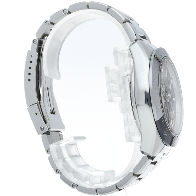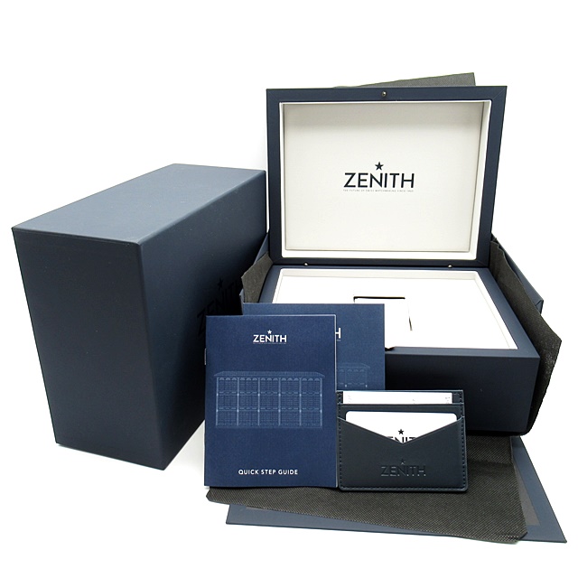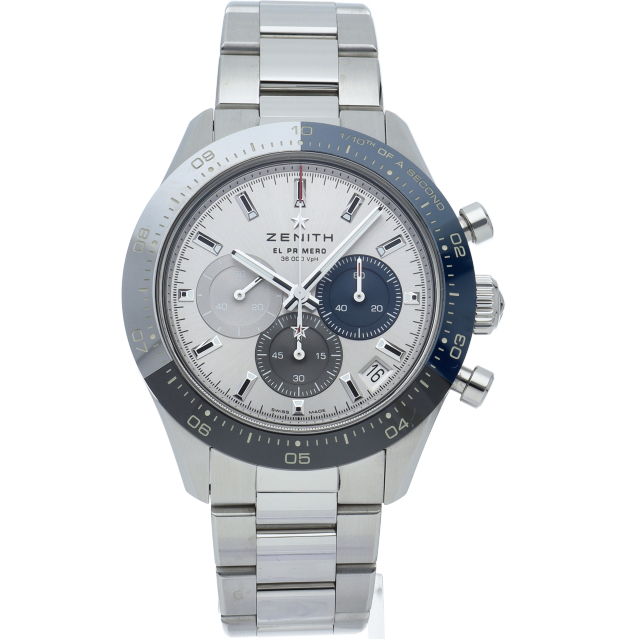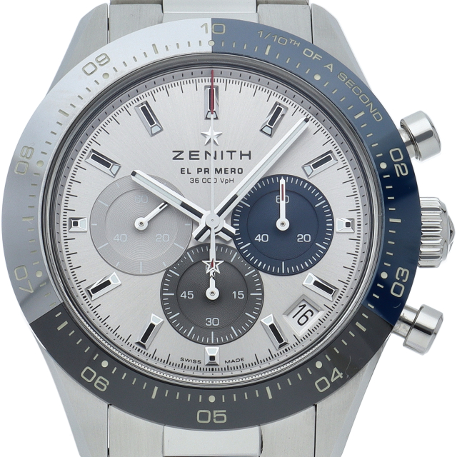 「クロノマスター スポーツ ブティック エディション」は、刻印が施されたセラミック製ベゼルが特徴となっています。伝統的なエル・プリメロのトリコロールカラーであるグレー、アンスラサイト、ブルーの3色のセラミック要素で構成されており、同じくセラミック製のベゼルのベース部分でシームレスに鍛造されています。ゼニスブティック限定モデル。希少モデルです。