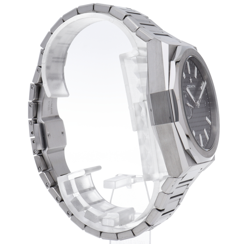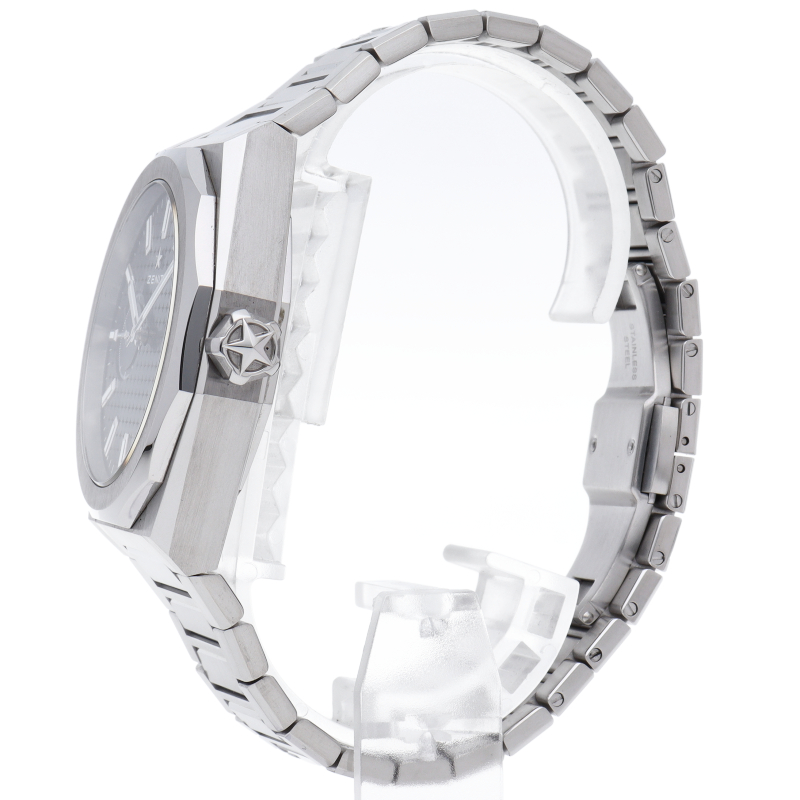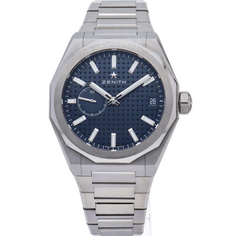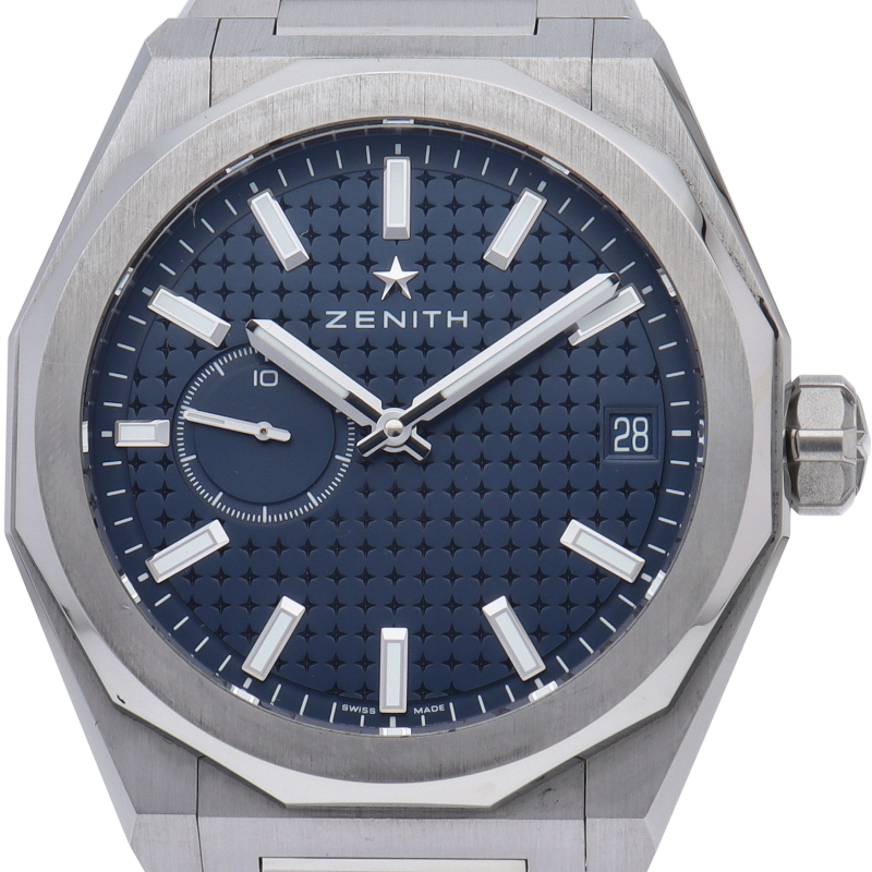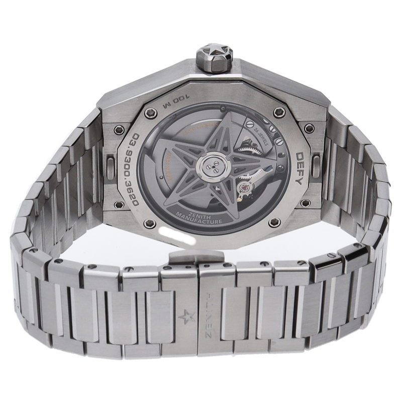 「デファイ スカイライン」では、ファセットカットのベゼルを配した41mmスチール製の八角形のケスを使用し、ブルートーンのサンバースト仕上げを施した文字盤にはゼニスの象徴である4つの点を結んだ星を復刻させてあしらっています。1/10秒精度を誇る初のインジケーターを備えた高振動エル・プリメロ 3620自動巻クロノグラフムーブメントを搭載。交換可能なスチール製ブレスレットとブルーパターンのラバーストラップ。