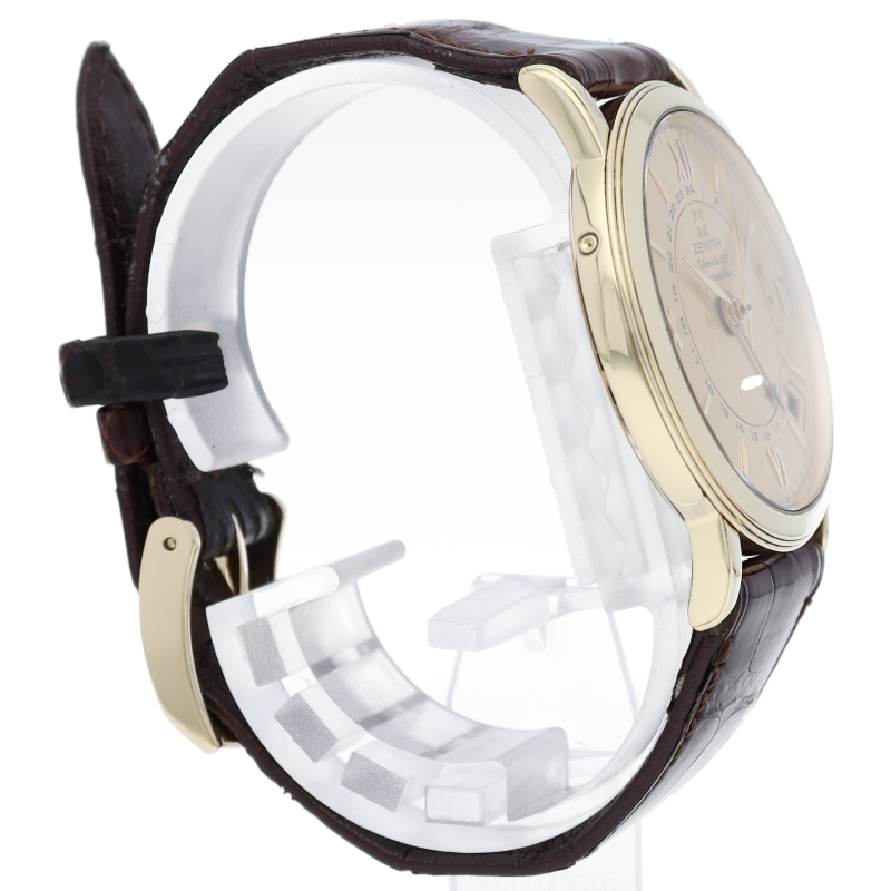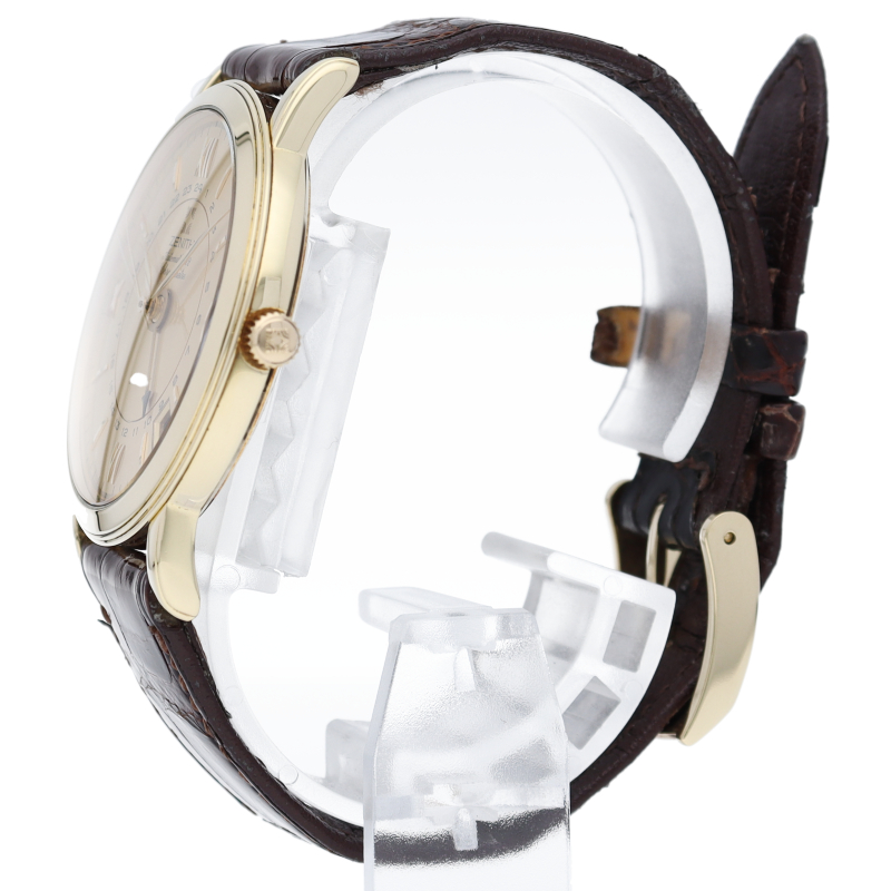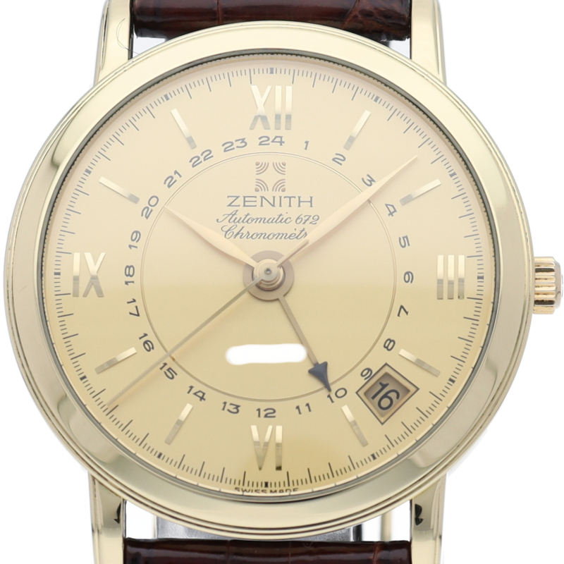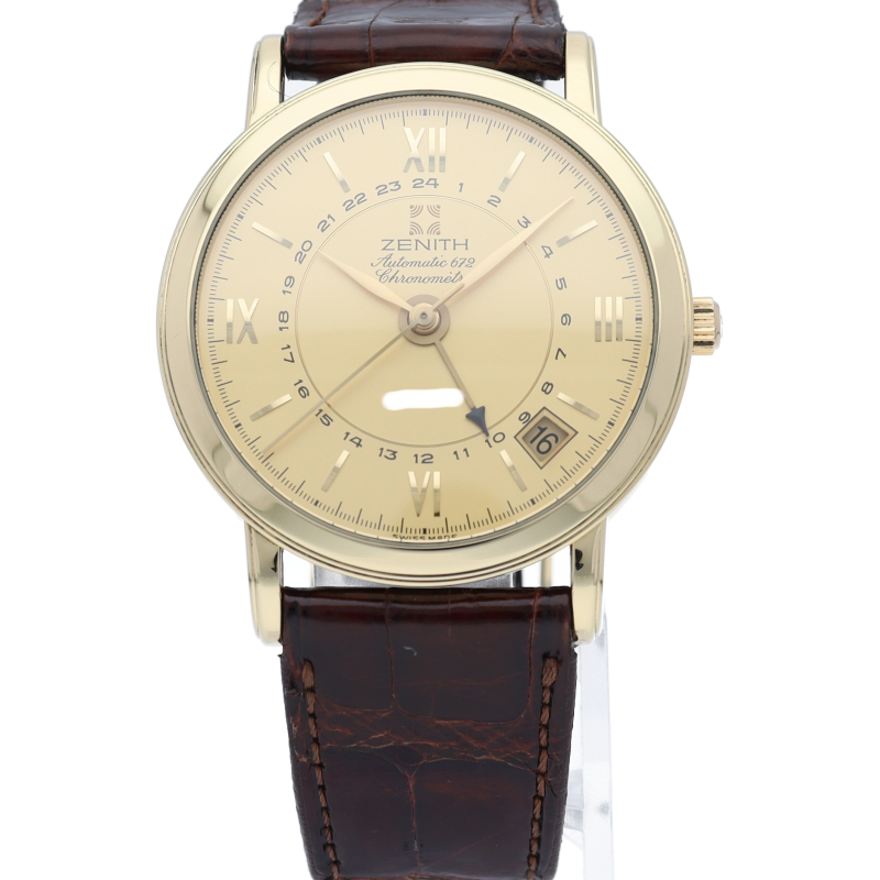 ゴールドの針とローマンインデックスが配された「オートマティック 672 クロノメーター」。18金イエローゴールド製のゴージャスなケースにGMT機能が備わったCal.672が搭載された希少な一本です。